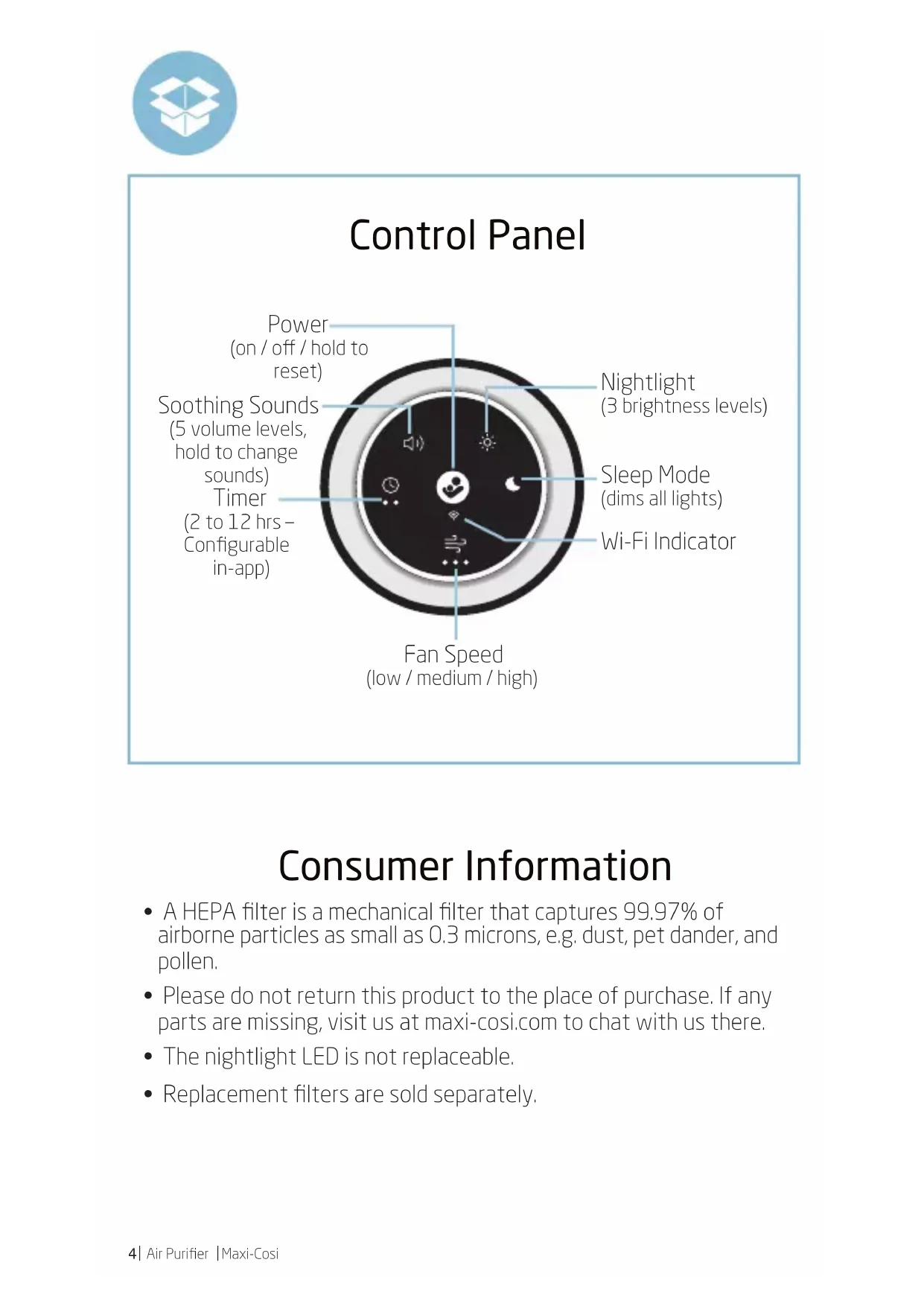 - Replacement filters are sold separately. Control Panel Fan Speed (low / medium / high) Wi-Fi Indicator Power (on / o / hold to reset) Timer (2 to 12 hrs – Configurable in-app) Soothing Sounds (5 volume levels, hold to change sounds) Sleep Mode (dims all lights) Nightlight (3 brightness levels)Maxi-Cosi