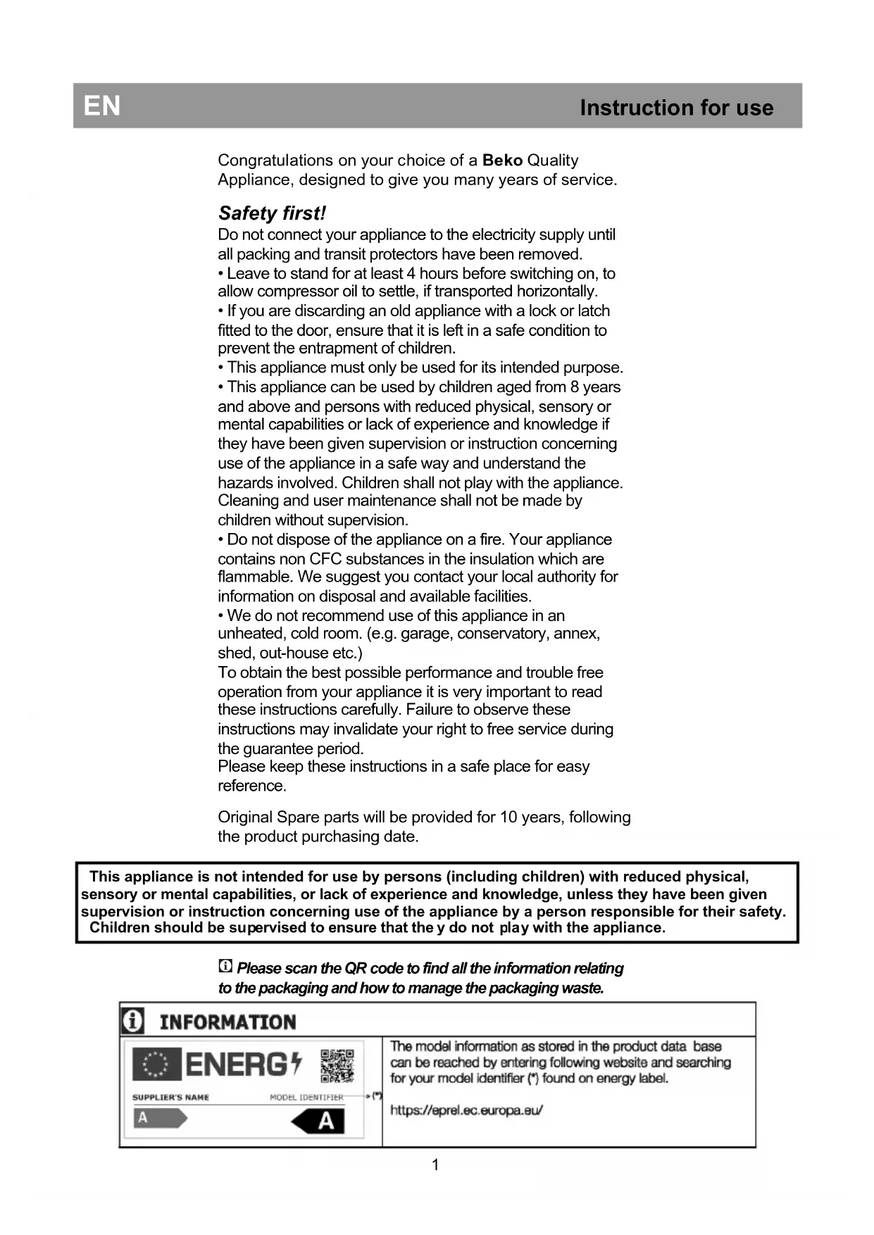 - We do not recommend use of this appliance in an unheated, cold room. (e.g. garage, conservatory, annex, shed, out-house etc.) To obtain the best possible performance and trouble free operation from your appliance it is very important to read these instructions carefully. Failure to observe these instructions may invalidate your right to free service during the guarantee period. Please keep these instructions in a safe place for easy reference. Original Spare parts will be provided for 10 years, following the product purchasing date.