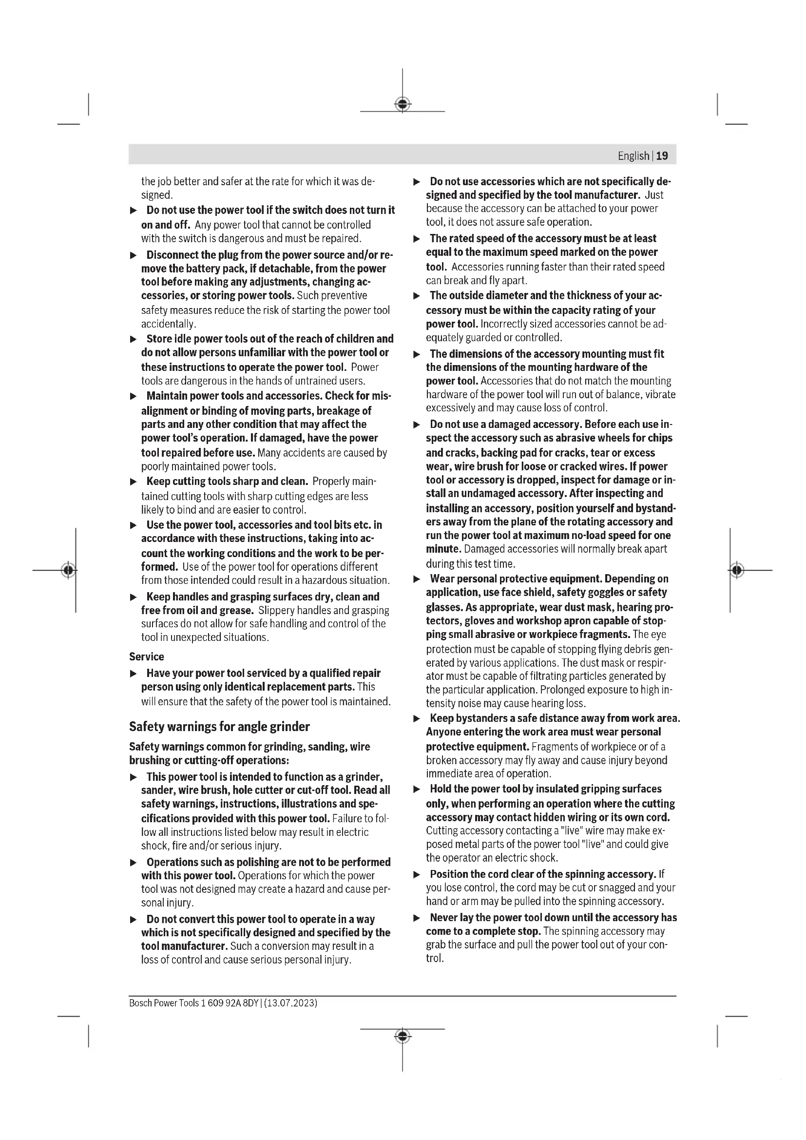 äußeren Abmessung größer als 25cm sind, im Einzel- handelsgeschäft oder in unmittelbarer Nähe hierzu un- entgeltlich zurückzunehmen; die Rücknahme darf nicht an den Kauf eines Elektro- oder Elektronikgerätes ge- knüpft werden und ist auf drei Altgeräte pro Geräteart beschränkt. Der Vertreiber hat beim Abschluss des Kaufvertrags für das neue Elektro- oder Elektronikgerät den Endnutzer über die Möglichkeit zur unentgeltlichen Rückgabe bzw. Abholung des Altgeräts zu informieren und den Endnutzer nach seiner Bosch Power Tools 1 609 92A 8DY | (13.07.2023)18 | English Absicht zu befragen, ob bei der Auslieferung des neuen Ge- räts ein Altgerät zurückgegeben wird. Dies gilt auch bei Vertrieb unter Verwendung von Fernkom- munikationsmitteln, wenn die Lager- und Versandflächen für Elektro- und Elektronikgeräte mindestens 400m² betragen oder die gesamten Lager- und Versandflächen mindestens 800m² betragen, wobei die unentgeltliche Abholung auf Elektro- und Elektronikgeräte der Kategorien 1 (Wärmeüber- träger), 2 (Bildschirmgeräte) und 4 (Großgeräte mit mindes- tens einer äußeren Abmessung über 50cm) beschränkt ist. Für alle übrigen Elektro- und Elektronikgeräte muss der Ver- treiber geeignete Rückgabemöglichkeiten in zumutbarer Ent- fernung zum jeweiligen Endnutzer gewährleisten; das gilt auch für Altgeräte, die in keiner äußeren Abmessung größer als 25cm sind, die der Endnutzer zurückgeben will, ohne ein neues Gerät zu kaufen. English Safety Instructions General Power Tool Safety Warnings WARNING Read all safety warnings, instruc- tions, illustrations and specifica- tions provided with this power tool. Failure to follow all in- structions listed below may result in electric shock, fire and/ or serious injury. Save all warnings and instructions for future reference. The term "power tool" in the warnings refers to your mains- operated (corded) power tool or battery-operated (cord- less) power tool. Work area safety u Keep work area clean and well lit. Cluttered or dark areas invite accidents. u Do not operate power tools in explosive atmospheres, such as in the presence of flammable liquids, gases or dust. Power tools create sparks which may ignite the dust or fumes. u Keep children and bystanders away while operating a power tool. Distractions can cause you to lose control. Electrical safety u Power tool plugs must match the outlet. Never modify the plug in any way. Do not use any adapter plugs with earthed (grounded) power tools. Unmodified plugs and matching outlets will reduce risk of electric shock. u Avoid body contact with earthed or grounded sur- faces, such as pipes, radiators, ranges and refrigerat- ors. There is an increased risk of electric shock if your body is earthed or grounded. u Do not expose power tools to rain or wet conditions. Water entering a power tool will increase the risk of elec- tric shock. u Do not abuse the cord. Never use the cord for carry- ing, pulling or unplugging the power tool. Keep cord away from heat, oil, sharp edges or moving parts. Damaged or entangled cords increase the risk of electric shock. u When operating a power tool outdoors, use an exten- sion cord suitable for outdoor use. Use of a cord suit- able for outdoor use reduces the risk of electric shock. u If operating a power tool in a damp location is un- avoidable, use a residual current device (RCD) protec- ted supply. Use of an RCD reduces the risk of electric shock. Personal safety u Stay alert, watch what you are doing and use common sense when operating a power tool. Do not use a power tool while you are tired or under the influence of drugs, alcohol or medication. A moment of inatten- tion while operating power tools may result in serious per- sonal injury. u Use personal protective equipment. Always wear eye protection. Protective equipment such as a dust mask, non-skid safety shoes, hard hat or hearing protection used for appropriate conditions will reduce personal in- juries. u Prevent unintentional starting. Ensure the switch is in the off-position before connecting to power source and/or battery pack, picking up or carrying the tool. Carrying power tools with your finger on the switch or en- ergising power tools that have the switch on invites acci- dents. u Remove any adjusting key or wrench before turning the power tool on. A wrench or a key left attached to a rotating part of the power tool may result in personal in- jury. u Do not overreach. Keep proper footing and balance at all times. This enables better control of the power tool in unexpected situations. u Dress properly. Do not wear loose clothing or jew- ellery. Keep your hair and clothing away from moving parts. Loose clothes, jewellery or long hair can be caught in moving parts. u If devices are provided for the connection of dust ex- traction and collection facilities, ensure these are con- nected and properly used. Use of dust collection can re- duce dust-related hazards. u Do not let familiarity gained from frequent use of tools allow you to become complacent and ignore tool safety principles. A careless action can cause severe in- jury within a fraction of a second. Power tool use and care u Do not force the power tool. Use the correct power tool for your application. The correct power tool will do 1 609 92A 8DY | (13.07.2023) Bosch Power ToolsEnglish | 19 the job better and safer at the rate for which it was de- signed. u Do not use the power tool if the switch does not turn it on and off. Any power tool that cannot be controlled with the switch is dangerous and must be repaired. u Disconnect the plug from the power source and/or re- move the battery pack, if detachable, from the power tool before making any adjustments, changing ac- cessories, or storing power tools. Such preventive safety measures reduce the risk of starting the power tool accidentally. u Store idle power tools out of the reach of children and do not allow persons unfamiliar with the power tool or thes
