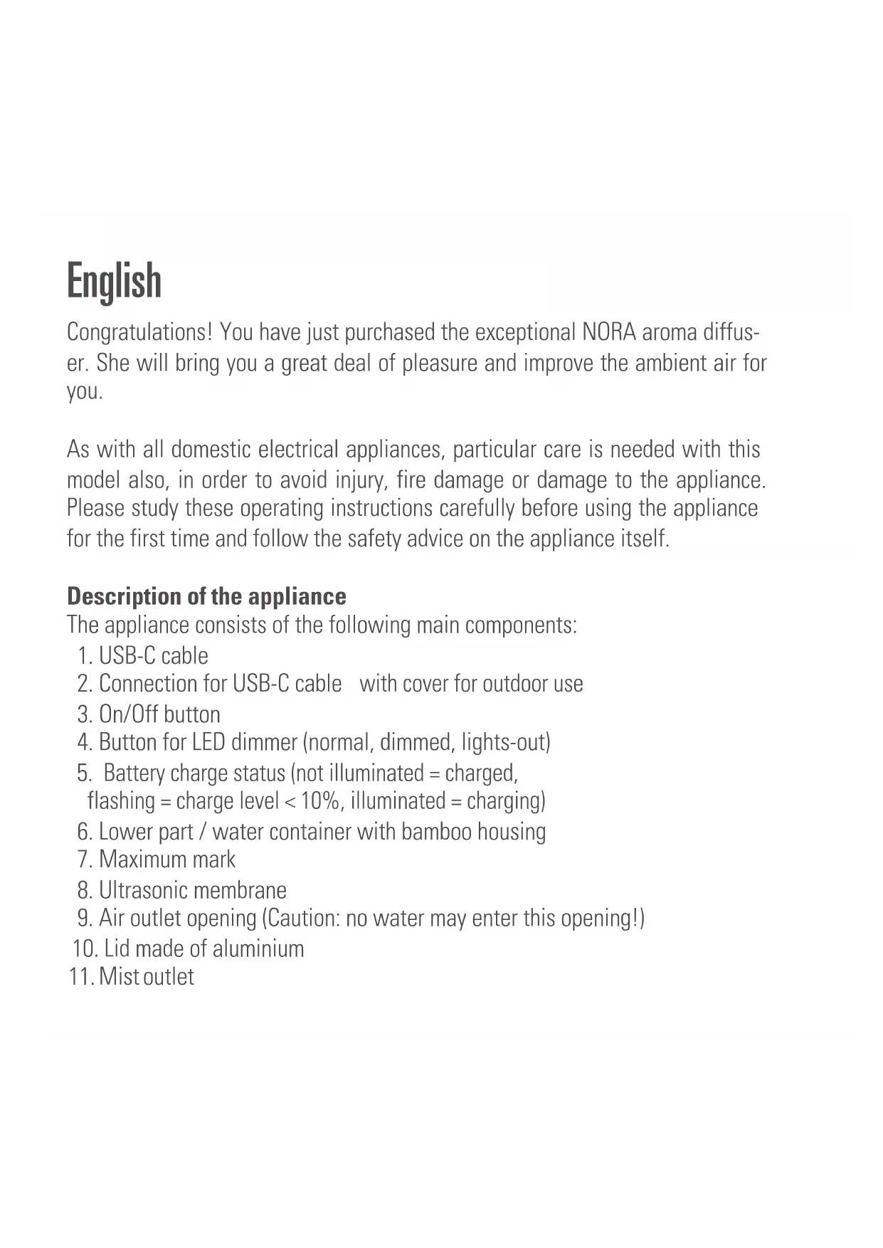 - In the event of a repair, the following points must be observed before the appliance is shipped or taken to the dealer: completely empty the water in the appliance (water tray or water tank), and allow the appliance to dry complete- ly. Appliances containing residual water may be damaged during transport, invalidating the warranty.Disposal The European directive 2012 / 19 / CE on Waste Electrical and Electronic Equip- ment (WEEE), requires that old household electrical appliances must not be disposed in the normal unsorted municipal waste stream. Old appliances must be collected separately in order to optimize the recovery and recycling of the materials they contain and reduce the impact on human health and the environ- ment. The crossed out “wheeled bin” symbol on the product reminds you of your obligation, that when you dispose of the appliance it must be separately collect- ed. Consumers should contact their local authority or retailer for information concerning the correct disposal of their old appliance. Battery disposal method: This appliance contains batteries that are non-replaceable. When the battery is at end of life, the appliance shall be properly disposed of. Do not throw into the trash can, the electrode is wrapped in insulating paper, it can be recycled and reused.Specifications Rated voltage DC 5 V Power output 3 W Running time up to 7 h on battery power and up to 18 h on mains power Dimensions 101 x 83 mm (diameter x height) Weight 300 g Tank capacity 90 ml Sound level < 26 dB(A) Battery charging temperature range 0–45 °C, Humidity ≤85 % RH Battery model YY-1S2P18650 -5200mAh Complies with EU regulations CE / WEEE / RoHS / EAC / UKCA All rights for any technical modifications are reservedDeutsch Gratulation! Sie haben soeben die aussergewöhnliche Aroma Diffuser-Dame NORA erworben. Sie wird Ihnen viel Freude machen und die Raumluft für Sie verbessern. Wie bei allen elektrischen Haushaltsgeräten wird auch bei diesem Gerät zur Ver