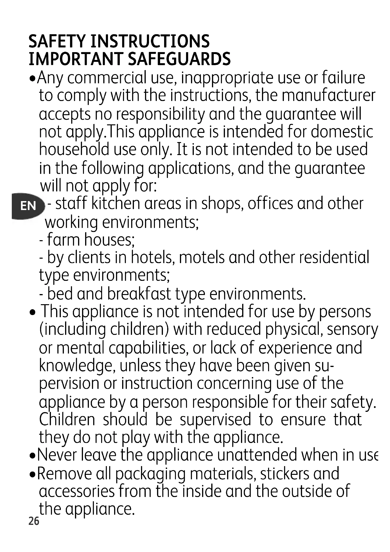- Any commercial use, inappropriate use or failure to comply with the instructions, the manufacturer accepts no responsibility and the guarantee will not apply.This appliance is intended for domestic household use only. It is not intended to be used in the following applications, and the guarantee will not apply for: - staff kitchen areas in shops, offices and other working environments; - farm houses; - by clients in hotels, motels and other residential type environments; - bed and breakfast type environments.