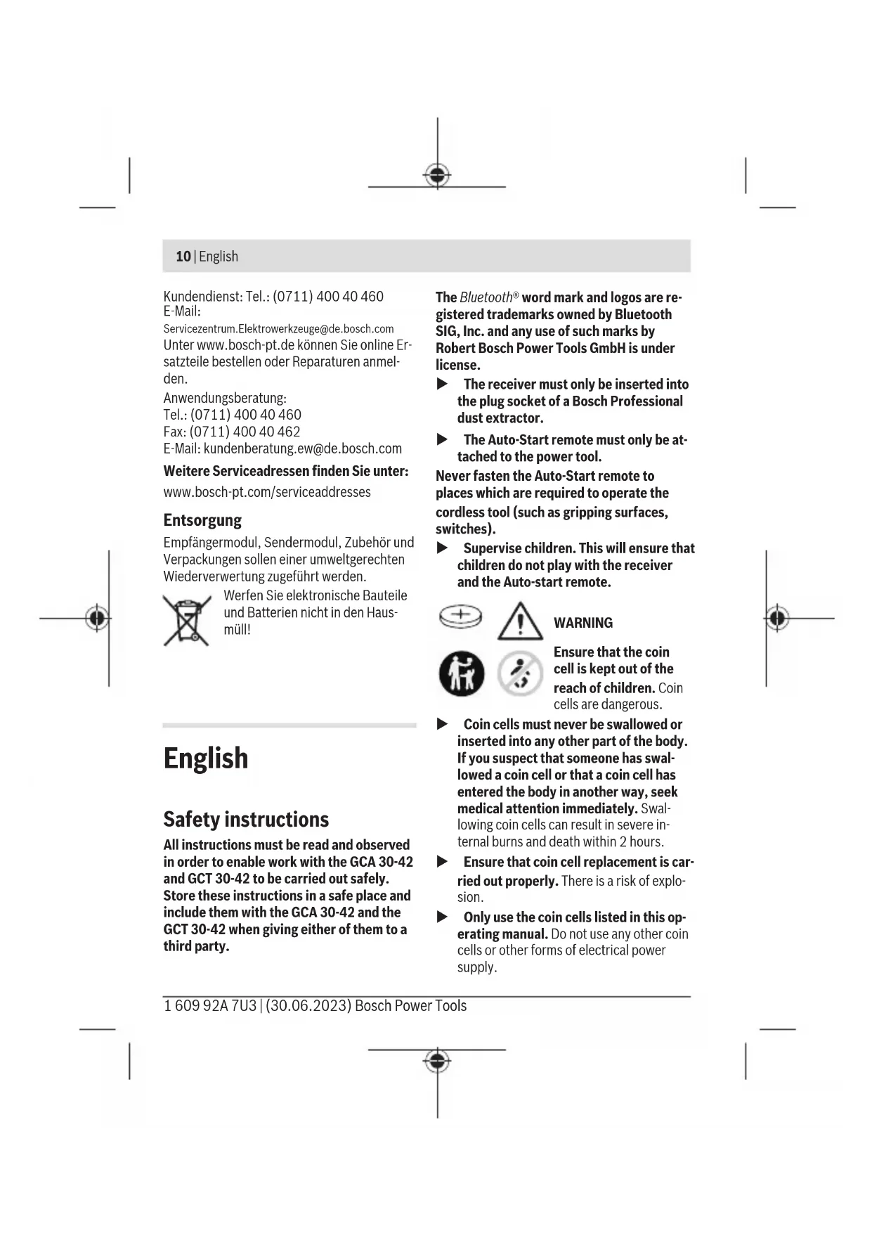 43x18x42mm Bosch Power Tools 1 609 92A 7U3 | (30.06.2023)12 | English Auto-Start remote GCT 30-42 Rubber band length 240mm Protection class IP54 Data transfer Bluetooth® Bluetooth® 4.2 (Low Energy) Frequency range used 2402–2480MHz Output power <10mW Energy supply Bluetooth® Low Energy mod- ule Coin cell 3V lithium battery, CR2032 A) Without rubber band Values can vary depending upon the product and are subject to application and environ- mental conditions. For further information www.bosch-professional.com/wac. Assembly and Operation Mounting the Auto-Start Remote – Attach one end of the rubber band(9) to one of the two fastening hooks(8). – Secure the Auto-Start remote(5) to the cordless tool. To do so, tighten the rubber band(9) and attach the free end to the second fastening hook(8). Cut the rubber band to the correct length, as necessary. Appropriate places are those at which the cordless tool generates sufficient vibration during operation. Never fasten the Auto- Start remote to places which are required to operate the cordless tool (such as grip- ping surfaces, switches, displays). Starting operation Establishing a connection between GCA30-42 and GCT30-42 – Ensure that the GCT30-42 Auto-Start re- mote is in the vicinity of the GCA30-42 re- ceiver. – Insert the mains plug of the dust extractor into the mains socket. – Set the switch of the dust extractor to automatic start/stop. – Insert the plug(4) of the GCA30-42 receiver(1) into the plug socket on the dust extractor. – The status indicator with the Auto-Start symbol(2) flashes blue. – Press the start/stop button(7) on the GCT30-42 Auto-Start remote until the LED status indicator(6) has flashed blue twice. The LED status indicator(6) on the Auto- Start remote GCT 30-42 briefly lights up blue. Connection established: – The status indicator with the Auto-Start symbol(2) on the GCA30-42 receiver lights up green. – The LED status indicator(6) on the GCA30-42 Auto-Start remote briefly lights up green. When changing a coin cell, the following shall apply: – If the GCT 30-42 transmitter module was connected to the GCA 30-42 receiver module before changing the coin cell, the connection is automatically re-established after changing the coin cell. 1 609 92A 7U3 | (30.06.2023) Bosch Power ToolsEnglish | 13 – If the modules were not connected before replacing the coin cell, the connection needs to be established. After a reset, the Auto-Start remote and the receiver must be reconnected. Auto Starting the Dust Extractor – Insert the extraction hose into the dust ex- traction attachment of the cordless tool. Vibration Detection The GCT 30-42 transmitter module is equipped with vibration detection. If it detects the vibrations of the activated cordless tool, the dust extractor will switch on automatically. If you switch off the cordless tool, the dust ex- tractor switches off automatically after a cer- tain run-on time. Switching On and Off Manually – Briefly press the start/stop button(7) on the Auto-Start remote(5). The dust extractor switches on. – To switch off the dust extractor, press the start/stop button(7) on the Auto-Start re- mote again. Note: If you switch off the dust extractor with the start/stop button(7) on the Auto-Start re- mote, the dust extractor will automatically switch on again once the Auto-Start remote(5) detects the vibrations of the cord- less tool. Resetting to Factory Settings – Receiver GCA30-42: Press and hold the(3) button until the status indicator with the Auto-Start symbol(2) flashes blue four times in quick succession. – GCT30-42 Auto-Start remote: Press and hold the start/stop button(7) until the LED status indicator(6) flashes blue four times in quick succession. Status indications GCA 30-42: Status indicator(2) Meaning/cause Solution Blue – Connection is established