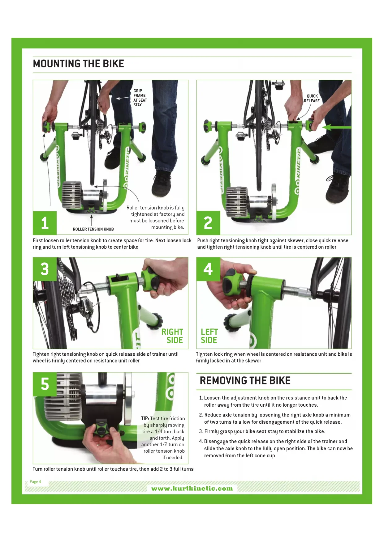 STAY TIP: Test tire friction by sharply moving tire a 1/4 turn back and forth. Apply another 1/2 turn on roller tension knob if needed. ROLLER TENSION KNOBPage 4*FOR YOUR SAFETY We recommend using the skewer that was included with your trainer. » Be sure that your bike is correctly installed and securely locked into the trainer before riding. » Do not over-tighten the roller tension knob. Over-tightening will cause both tire and unit damage. Tighten only enough to avoid tire slippage. » When using the trainer for normal use or for extended periods of time, the resistance unit will get hot. DO NOT touch the resistance unit while it is in use or while it is hot. » Always consult a doctor before beginning any exercise routine or using any tness product including the Kinetic Trainer. Should you become ill, feel dizzy, light-headed or nauseous while riding the trainer, stop riding immediately and seek medical attention. » While in use, the wheel of your bike and the resistance unit may be spinning at high speeds. For this reason keep children, pets and all items safely away from your trainer while in use. » Always use the trainer on a at surface. » Single-speed bikes with nutted axles require an additional standard cone cup for proper use. SAFETY WARNINGS