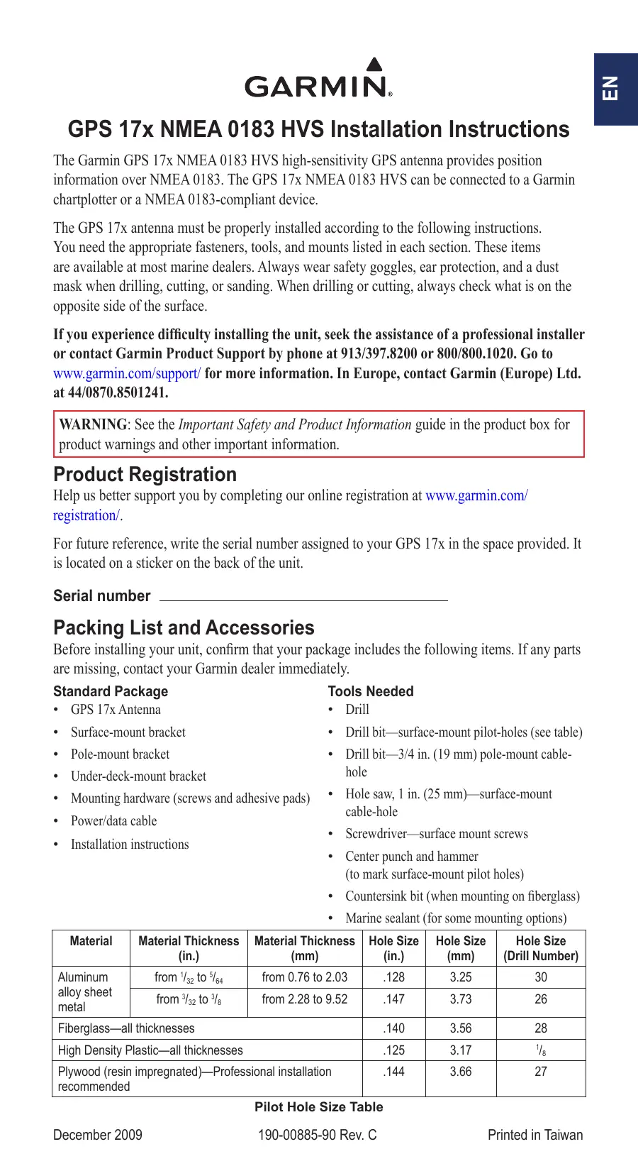 GPS 17x NMEA 0183 HVS Installation Instructions The Garmin GPS 17x NMEA 0183 HVS high-sensitivity GPS antenna provides position information over NMEA 0183. The GPS 17x NMEA 0183 HVS can be connected to a Garmin chartplotter or a NMEA 0183-compliant device. The GPS 17x antenna must be properly installed according to the following instructions. You need the appropriate fasteners, tools, and mounts listed in each section. These items are available at most marine dealers. Always wear safety goggles, ear protection, and a dust mask when drilling, cutting, or sanding. When drilling or cutting, always check what is on the opposite side of the surface. If you experience difficulty installing the unit, seek the assistance of a professional installer or contact Garmin Product Support by phone at 913/397.8200 or 800/800.1020. Go to www.garmin.com/support/ for more information. In Europe, contact Garmin (Europe) Ltd. at 44/0870.8501241. WARNING: See the Important Safety and Product Information guide in the product box for product warnings and other important information.