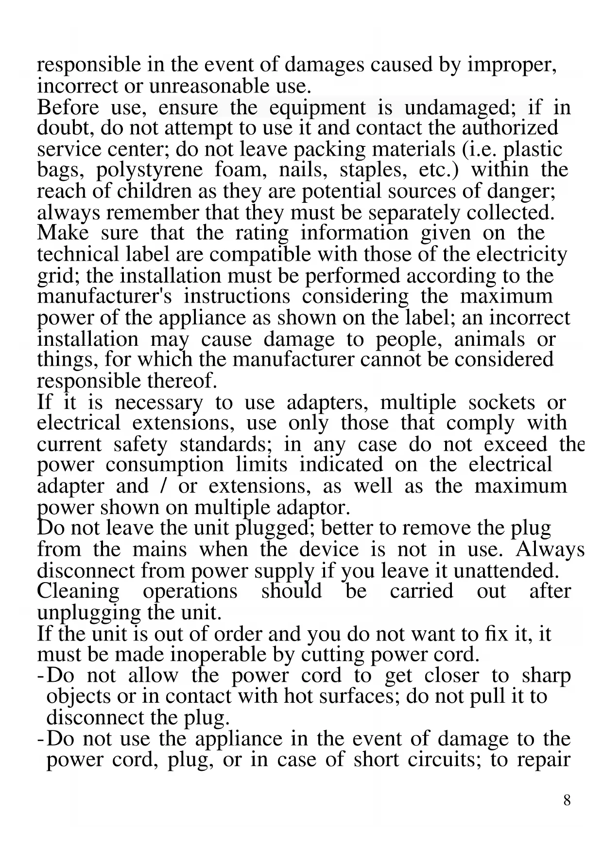 The following are important notes on the installation, use and maintenance; save this instruction manual for future reference; use the equipment only as specified in this guide; any other use is considered improper and dangerous; therefore, the manufacturer cannot be held8 responsible in the event of damages caused by improper, incorrect or unreasonable use. Before use, ensure the equipment is undamaged; if in doubt, do not attempt to use it and contact the authorized service center; do not leave packing materials (i.e. plastic bags, polystyrene foam, nails, staples, etc.) within the reach of children as they are potential sources of danger; always remember that they must be separately collected. Make sure that the rating information given on the technical label are compatible with those of the electricity grid; the installation must be performed according to the manufacturer's instructions considering the maximum power of the appliance as shown on the label; an incorrect installation may cause damage to people, animals or things, for which the manufacturer cannot be considered responsible thereof. If it is necessary to use adapters, multiple sockets or electrical extensions, use only those that comply with current safety standards; in any case do not exceed the power consumption limits indicated on the electrical adapter and / or extensions, as well as the maximum power shown on multiple adaptor. Do not leave the unit plugged; better to remove the plug from the mains when the device is not in use. Always disconnect from power supply if you leave it unattended. Cleaning operations should be carried out after unplugging the unit. If the unit is out of order and you do not want to fix it, it must be made inoperable by cutting power cord. - Do not allow the power cord to get closer to sharp objects or in contact with hot surfaces; do not pull it to disconnect the plug. - Do not use the appliance in the event of damage to the power cord, plug, or in case of short circuits; to repair9 the product only address an authorized service center. - Do not handle or touch the appliance with wet hands or bare feet. Do not expose the appliance to harmful weather conditions such as rain, moisture, frost, etc.. Always store it in a dry place. - This appliance can be used by children of 8 years and above and persons with reduced physical, sensory or mental capabilities or lack of experience and knowledge if they received supervision or instruction concerning use of the appliance in a safe way and understand hazards involved; children shall not play with the appliance; cleaning and user maintenance shall not be made by children without supervision. - Children must not play with the appliance. - Keep the appliance and its cord out of reach of children less than 8 years. If the power cord is damaged, or in case of failure and / or malfunction do not tamper with the unit. The reparation must be done by manufacturer or by service center authorized by the manufacturer in order to prevent any risk. Failure to comply with the above may compromise the unit safety and invalidate the warranty. - This appliance is intended to be used in household and similar applications such as: staff kitchen areas in shops, offices and other working environments; by clients in hotels, motels and other residential type environments; farm houses, bed and breakfast type environments. - The appliance is not intended to be operated by means of an external timer or separate remote-control system. - Before every use, unroll the power cord. - Use original spare parts and accessories only. - Do not subject the product to strong impacts, serious damages may result. Don’t use near or under flammable materials (like curtains), heat, cold spots and steam.10 GENERAL INSTRUCTIONS This unit is an automatic ice cubes maker of Class I, use only to produce ice Connect the device to a compatible power socket. Do not upend this product or incline it over 45° Do not immerse appliance in water or any other liquid. Unplug the appliance after using or before cleaning. Do not close the ventilation holes and keep the appliance 8cm from other objects to ensure the good heat releasing. To avoid risk of electric shock, do not pour water on cord, plug and ventilation. Do not use the appliance close by flames, gas, flammable materials, hot plates or stoves. Do not switch on the power button frequently (ensure al least 5 minutes interval) to avoid the damage of the compressor. Keep the lid close to save energy Do not switch on the power before having installed the accessories. Do not store any explosive substance or flammable liquids such as propellants inside the unit. Use only water that meets the requirements for drinking Use in ambients with temperature between 10° and 43° Do not store explosive substances such as aerosol cans with a flammable propellant in this appliance.