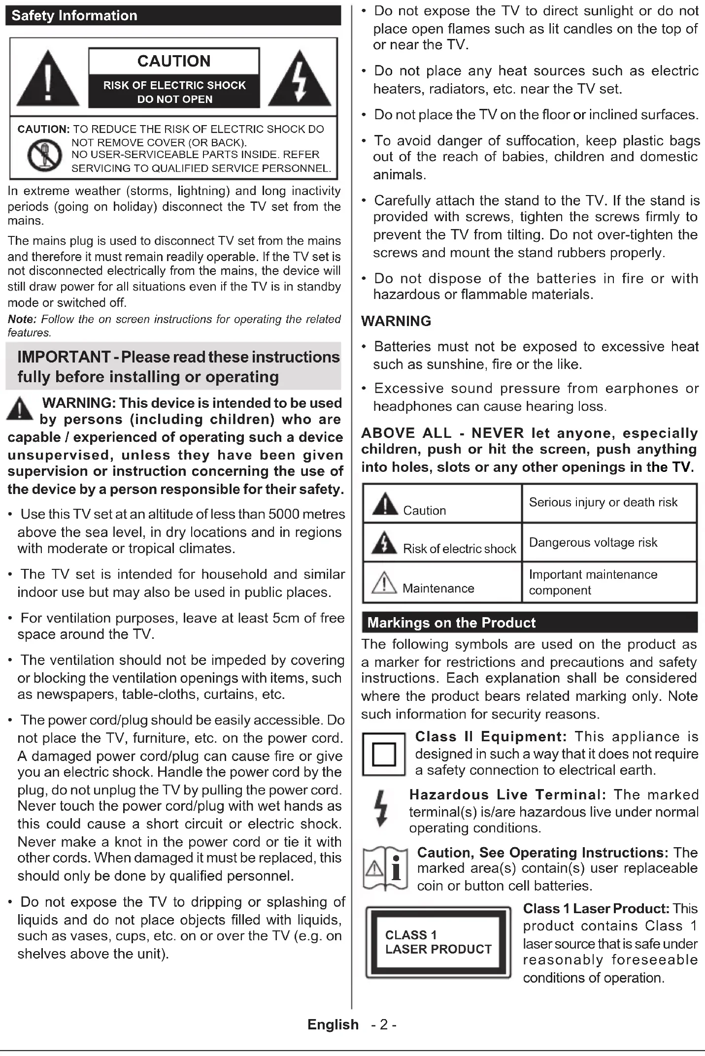 - Excessive sound pressure from earphones or headphones can cause hearing loss. ABOVE ALL - NEVER let anyone, especially children, push or hit the screen, push anything into holes, slots or any other openings in the TV. Caution Serious injury or death risk Risk of electric shock Dangerous voltage risk Maintenance Important maintenance component Markings on the Product The following symbols are used on the product as a marker for restrictions and precautions and safety instructions. Each explanation shall be considered where the product bears related marking only. Note such information for security reasons. Class II Equipment: This appliance is designed in such a way that it does not require a safety connection to electrical earth. Hazardous Live Terminal: The marked terminal(s) is/are hazardous live under normal operating conditions.