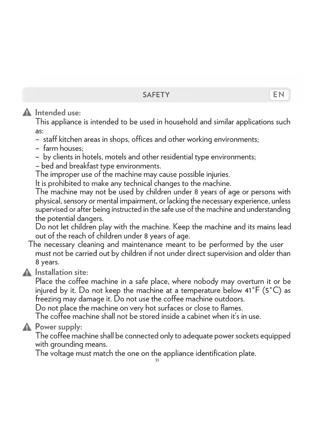 SAFETY Intended use: This appliance is intended to be used in household and similar applications such as: – staff kitchen areas in shops, offices and other working environments; – farm houses; – by clients in hotels, motels and other residential type environments; – bed and breakfast type environments. The improper use of the machine may cause possible injuries. It is prohibited to make any technical changes to the machine. The machine may not be used by children under 8 years of age or persons with physical, sensory or mental impairment, or lacking the necessary experience, unless supervised or after being instructed in the safe use of the machine and understanding the potential dangers. Do not let children play with the machine. Keep the machine and its mains lead out of the reach of children under 8 years of age. The necessary cleaning and maintenance meant to be performed by the user must not be carried out by children if not under direct supervision and older than 8 years. Installation site: Place the coffee machine in a safe place, where nobody may overturn it or be injured by it. Do not keep the machine at a temperature below 41°F (5°C) as freezing may damage it. Do not use the coffee machine outdoors. Do not place the machine on very hot surfaces or close to flames. The coffee machine shall not be stored inside a cabinet when it’s in use. Power supply: The coffee machine shall be connected only to adequate power sockets equipped with grounding means. The voltage must match the one on the appliance identification plate.34 ITEN Power supply cable