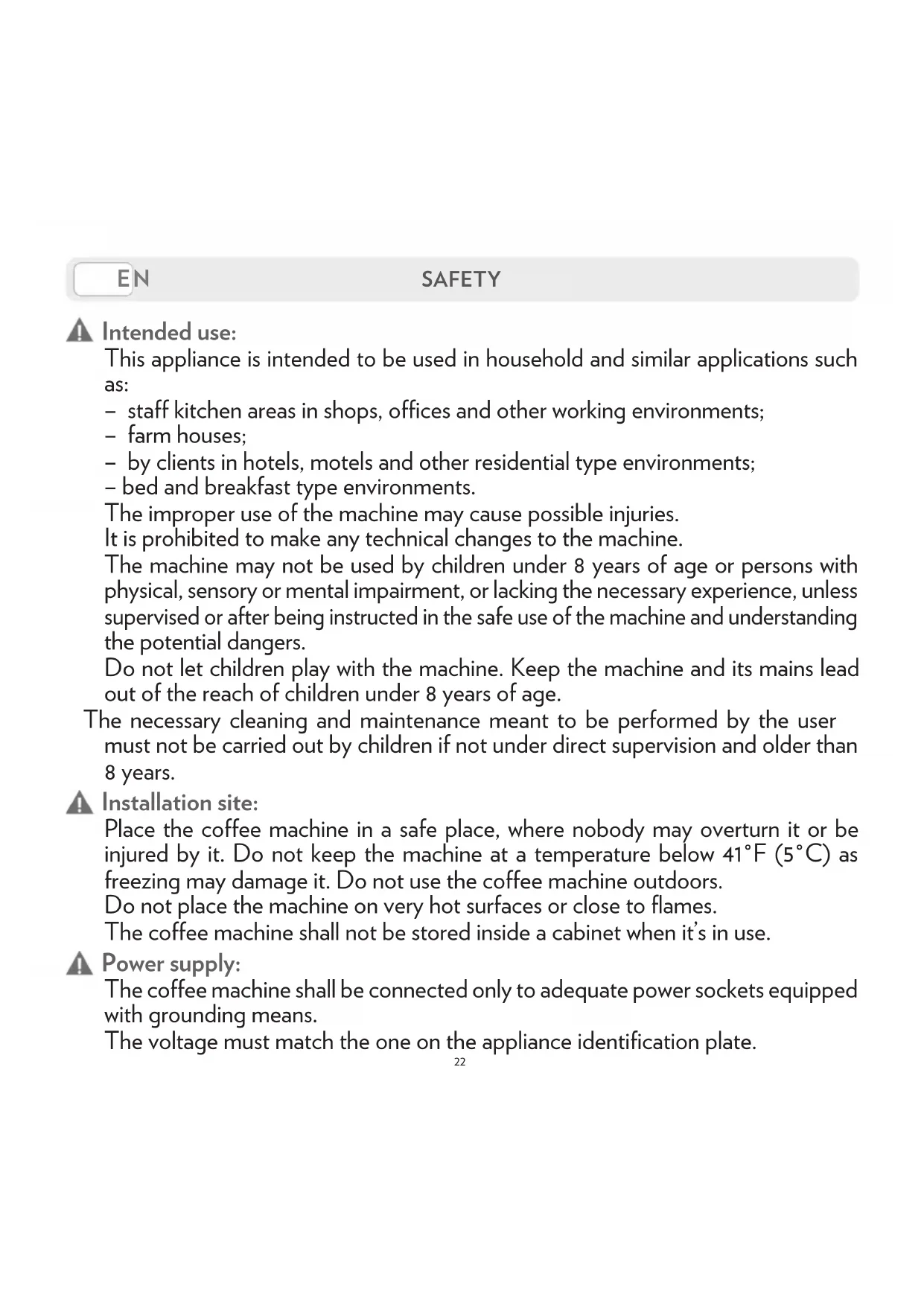 - Termofusibili22 ITEN SAFETY Intended use: This appliance is intended to be used in household and similar applications such as: – staff kitchen areas in shops, offices and other working environments; – farm houses; – by clients in hotels, motels and other residential type environments; – bed and breakfast type environments. The improper use of the machine may cause possible injuries. It is prohibited to make any technical changes to the machine. The machine may not be used by children under 8 years of age or persons with physical, sensory or mental impairment, or lacking the necessary experience, unless supervised or after being instructed in the safe use of the machine and understanding the potential dangers. Do not let children play with the machine. Keep the machine and its mains lead out of the reach of children under 8 years of age. The necessary cleaning and maintenance meant to be performed by the user must not be carried out by children if not under direct supervision and older than 8 years. Installation site: Place the coffee machine in a safe place, where nobody may overturn it or be injured by it. Do not keep the machine at a temperature below 41°F (5°C) as freezing may damage it. Do not use the coffee machine outdoors. Do not place the machine on very hot surfaces or close to flames. The coffee machine shall not be stored inside a cabinet when it’s in use. Power supply: The coffee machine shall be connected only to adequate power sockets equipped with grounding means. The voltage must match the one on the appliance identification plate.23