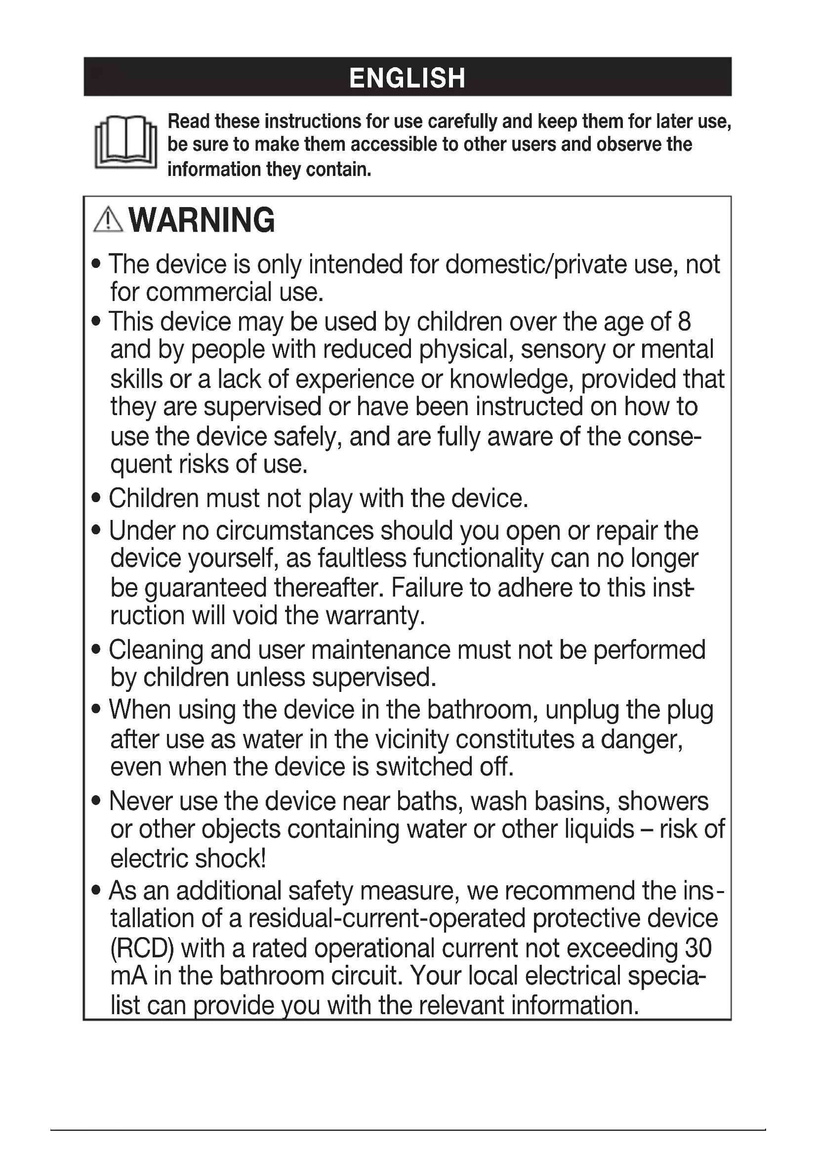 - When using the device in the bathroom, unplug the plug after use as water in the vicinity constitutes a danger, even when the device is switched o.