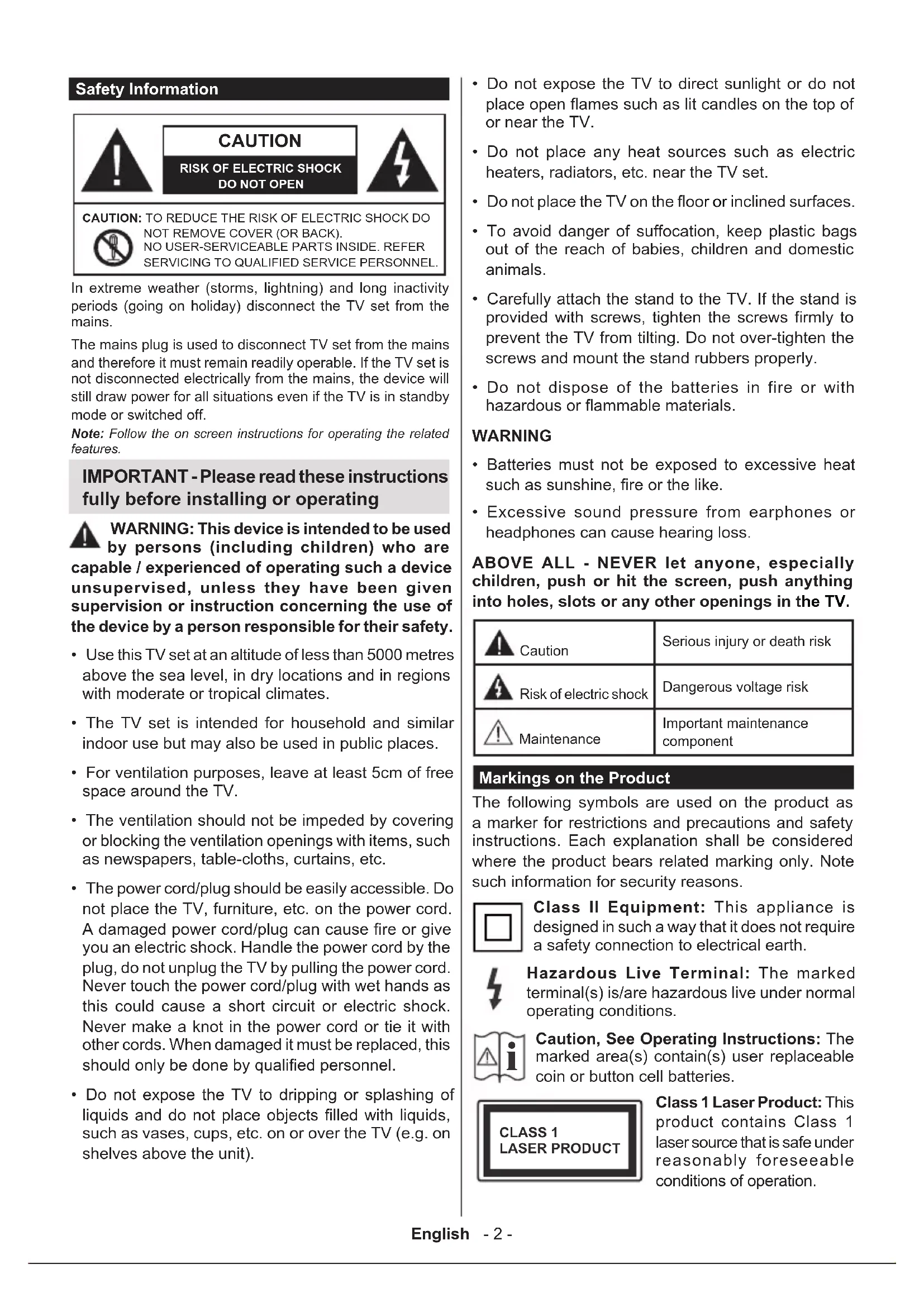 - Excessive sound pressure from earphones or headphones can cause hearing loss. ABOVE ALL - NEVER let anyone, especially children, push or hit the screen, push anything into holes, slots or any other openings in the TV. Caution Serious injury or death risk Risk of electric shock Dangerous voltage risk Maintenance Important maintenance component Markings on the Product The following symbols are used on the product as a marker for restrictions and precautions and safety instructions. Each explanation shall be considered where the product bears related marking only. Note such information for security reasons. Class II Equipment: This appliance is designed in such a way that it does not require a safety connection to electrical earth. Hazardous Live Terminal: The marked terminal(s) is/are hazardous live under normal operating conditions.