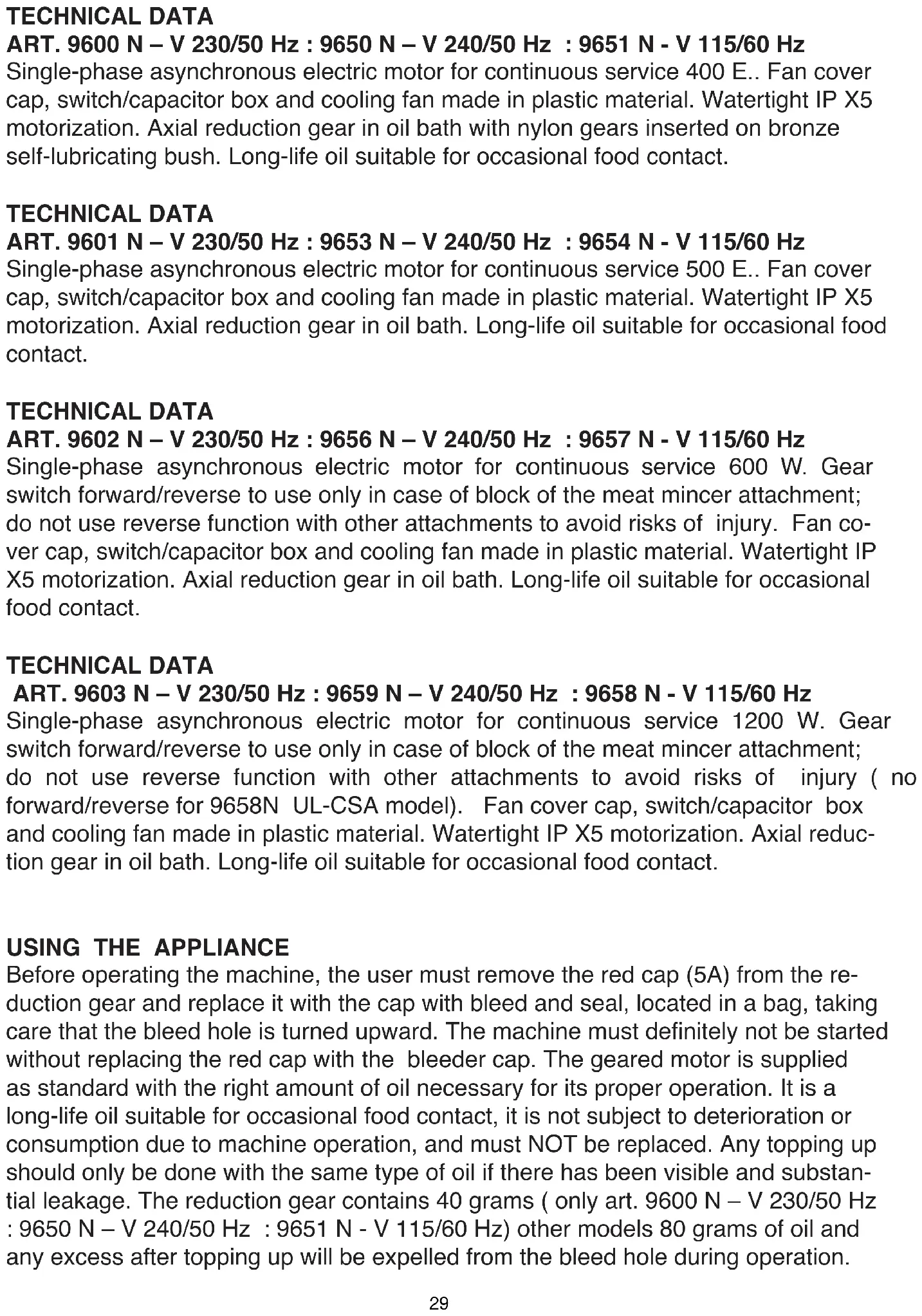 28TECHNICAL DATA ART. 9600 N – V 230/50 Hz : 9650 N – V 240/50 Hz : 9651 N - V 115/60 Hz Single-phase asynchronous electric motor for continuous service 400 E.. Fan cover cap, switch/capacitor box and cooling fan made in plastic material. Watertight IP X5 motorization. Axial reduction gear in oil bath with nylon gears inserted on bronze self-lubricating bush. Long-life oil suitable for occasional food contact. TECHNICAL DATA ART. 9601 N – V 230/50 Hz : 9653 N – V 240/50 Hz : 9654 N - V 115/60 Hz Single-phase asynchronous electric motor for continuous service 500 E.. Fan cover cap, switch/capacitor box and cooling fan made in plastic material. Watertight IP X5 motorization. Axial reduction gear in oil bath. Long-life oil suitable for occasional food contact. TECHNICAL DATA ART. 9602 N – V 230/50 Hz : 9656 N – V 240/50 Hz : 9657 N - V 115/60 Hz Single-phase asynchronous electric motor for continuous service 600 W. Gear switch forward/reverse to use only in case of block of the meat mincer attachment; do not use reverse function with other attachments to avoid risks of injury. Fan co- ver cap, switch/capacitor box and cooling fan made in plastic material. Watertight IP X5 motorization. Axial reduction gear in oil bath. Long-life oil suitable for occasional food contact. TECHNICAL DATA ART. 9603 N – V 230/50 Hz : 9659 N – V 240/50 Hz : 9658 N - V 115/60 Hz Single-phase asynchronous electric motor for continuous service 1200 W. Gear switch forward/reverse to use only in case of block of the meat mincer attachment; do not use reverse function with other attachments to avoid risks of injury ( no forward/reverse for 9658N UL-CSA model). Fan cover cap, switch/capacitor box and cooling fan made in plastic material. Watertight IP X5 motorization. Axial reduc- tion gear in oil bath. Long-life oil suitable for occasional food contact.