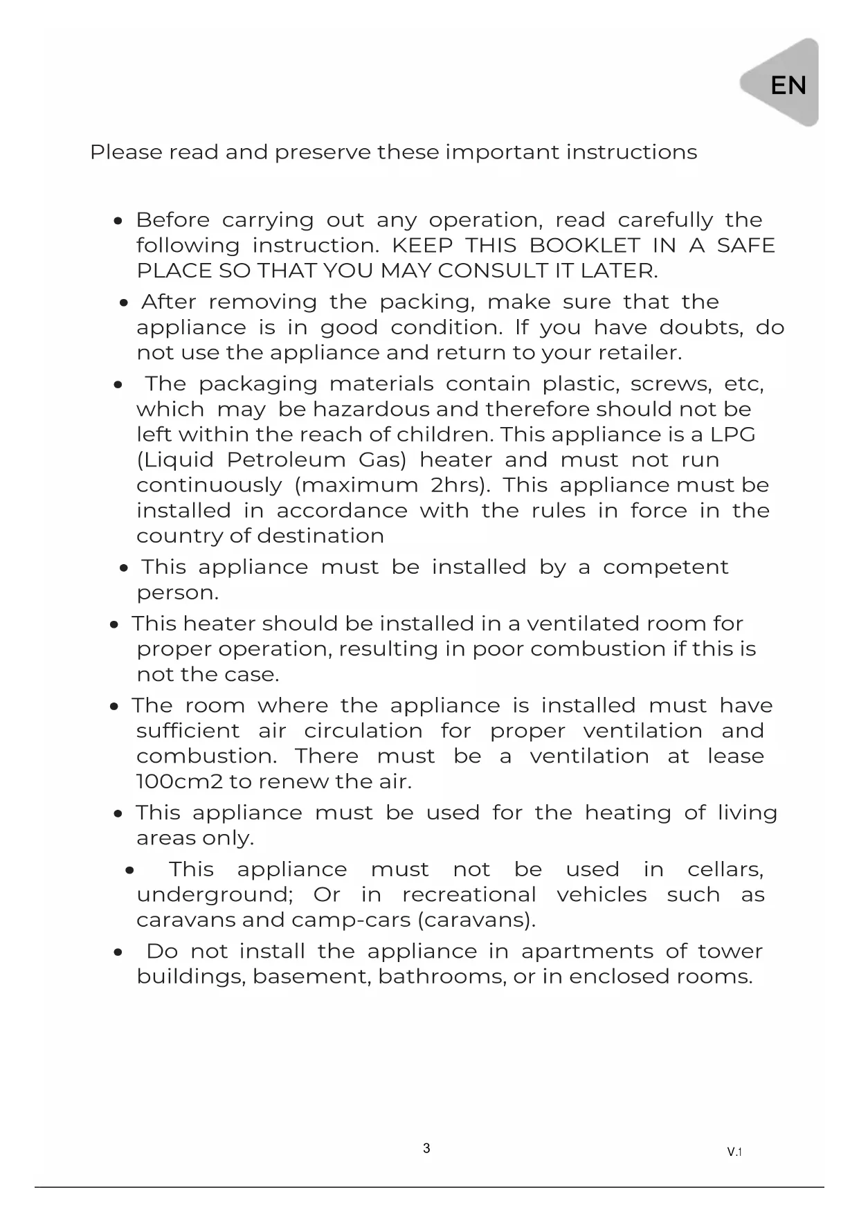 - The packaging materials contain plastic, screws, etc, which may be hazardous and therefore should not be left within the reach of children. This appliance is a LPG (Liquid Petroleum Gas) heater and must not run continuously (maximum 2hrs). This appliance must be installed in accordance with the rules in force in the country of destination