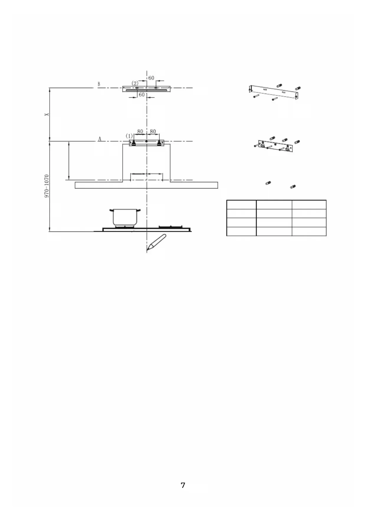 V.5INSTALLATION A vertical line up to the ceiling or up to the upper limit, at the center of the area in which the hood is to be fitted. A horizontal line A at 970 – 1070 mm above the cooker top. A horizontal line B at a X mm above the horizontal line A. A horizontal line C at a 243 mm below the horizontal line A . Mark Points: Mark a point (1) on the horizontal line A, 80 mm to the vertical reference line. Repeat this operation on the other side and on the vertical reference line, checking that the three marks are leveled. Mark a point (2) on the horizontal line B, 60 mm to the vertical reference line. Repeat this operation on the other side, checking that the two marks are on the same horizontal line. Mark a point (3) on the horizontal line C, 100 mm to the vertical reference line. Repeat this operation on the other side , checking that the two marks are leveled. Fix the brackets : Drill holes at the marked points with a ɸ10 mm drill bit. Insert the Wall Plugs 11 into the holes. Fix the hood fixing bracket 20 with 3 screws 10 (5 x 50) at the horizontal line