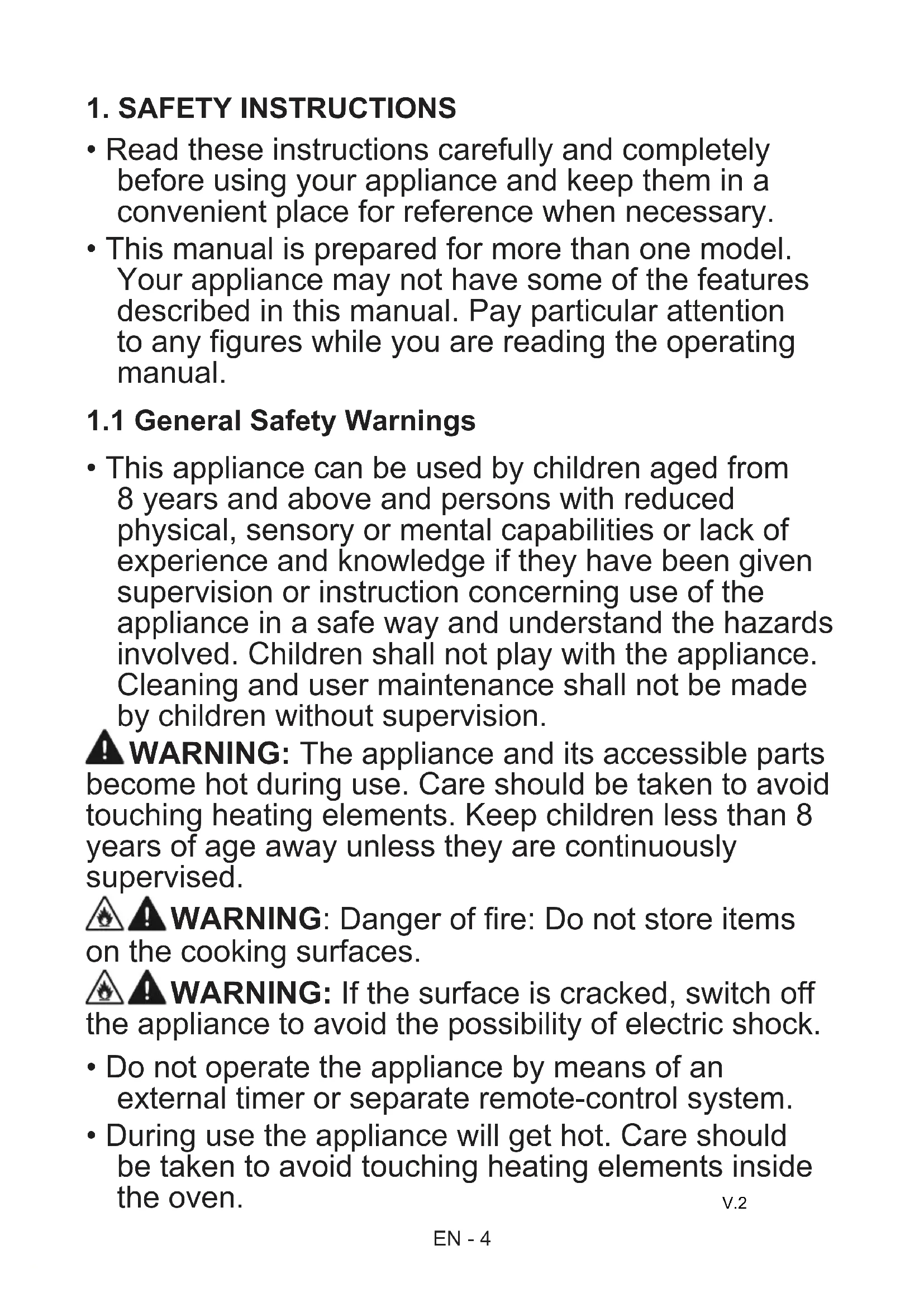- During use the appliance will get hot. Care should be taken to avoid touching heating elements inside the oven. V.2EN - 5