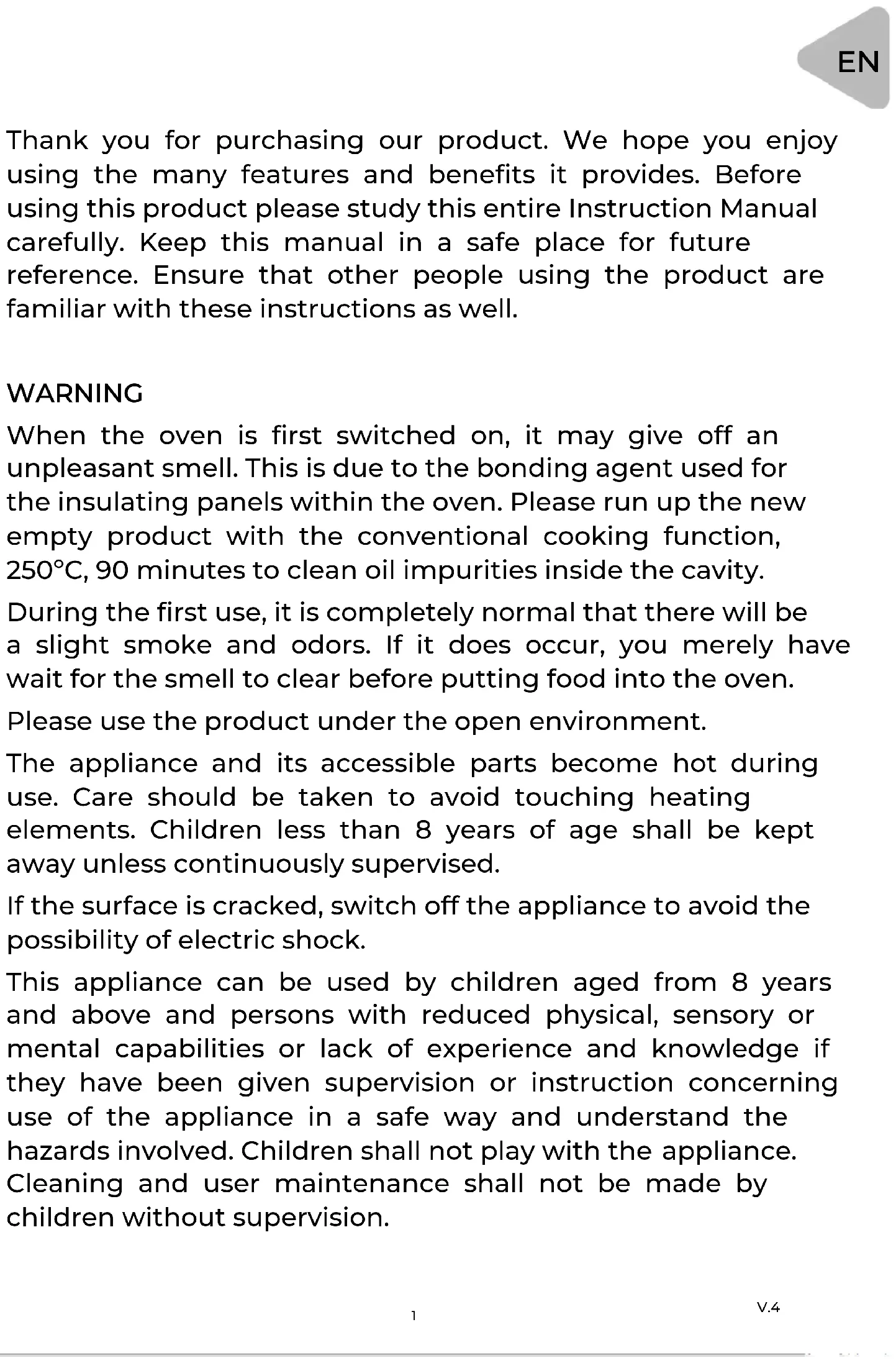 huelgas legales o ilegales; hechos de actuaciones de la Fuerzas Armadas o de los Cuerpos de Seguridad del Estado en tiempos de paz; conflictos armados y actos de guerra (declarada o no); reacción o radiación nuclear o contaminación radiactiva; vicio o defecto propio de los bienes; hechos calificados por el Gobierno de la Nación como de “catástrofe o calamidad nacional”. El diseño y las especificaciones están sujetos a cambios sin previo aviso para la mejora del producto. Cualquier modificación del manual se actualizará en nuestra página web, puede consultar la última versión. www.easelectric.es V.4 15Thank you for purchasing our product. We hope you enjoy using the many features and benefits it provides. Before using this product please study this entire Instruction Manual carefully. Keep this manual in a safe place for future reference. Ensure that other people using the product are familiar with these instructions as well. WARNING When the oven is first switched on, it may give off an unpleasant smell. This is due to the bonding agent used for the insulating panels within the oven. Please run up the new empty product with the conventional cooking function, 250ºC, 90 minutes to clean oil impurities inside the cavity. During the first use, it is completely normal that there will be a slight smoke and odors. If it does occur, you merely have wait for the smell to clear before putting food into the oven. Please use the product under the open environment. The appliance and its accessible parts become hot during use. Care should be taken to avoid touching heating elements. Children less than 8 years of age shall be kept away unless continuously supervised. If the surface is cracked, switch off the appliance to avoid the possibility of electric shock. This appliance can be used by children aged from 8 years and above and persons with reduced physical, sensory or mental capabilities or lack of experience and knowledge if they have been given supervision or instruction concerning use of the appliance in a safe way and understand the hazards involved. Children shall not play with the appliance. Cleaning and user maintenance shall not be made by children without supervision.
