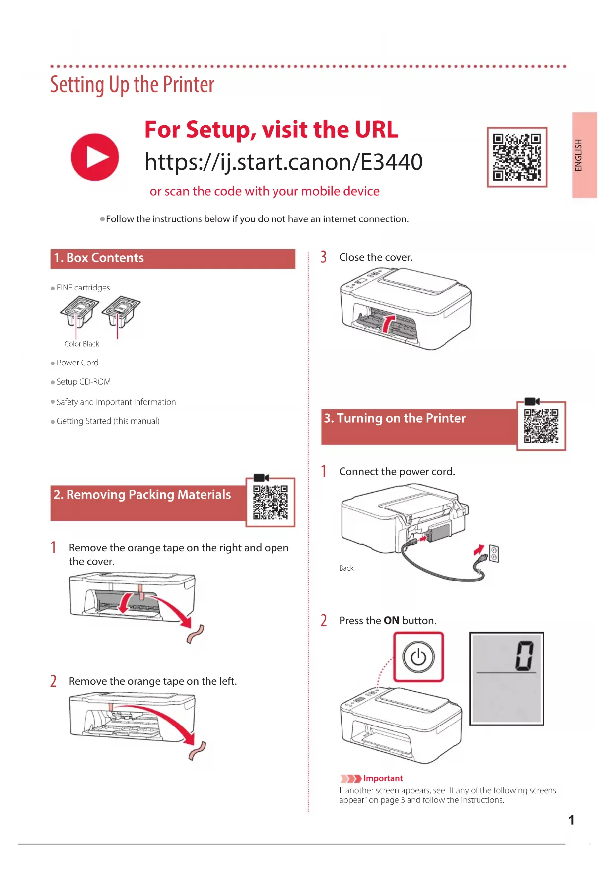 Press the ON button. ImportantIf another screen appears, see "If any of the following screens appear" on page 3 and follow the instructions. For Setup, visit the URL https://ij.start.canon/E3440 or scan the code with your mobile device