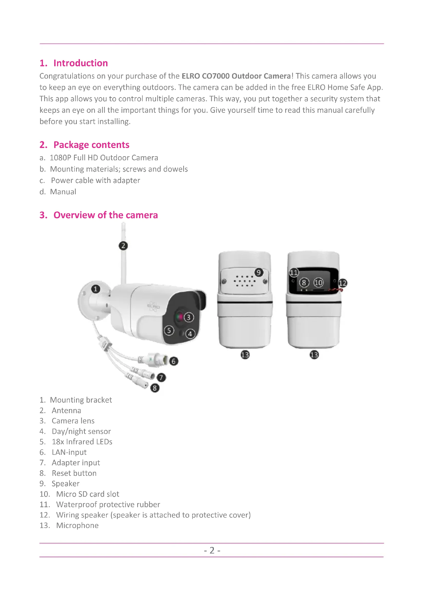 Congratulations on your purchase of the ELRO CO7000 Outdoor Camera! This camera allows you to keep an eye on everything outdoors. The camera can be added in the free ELRO Home Safe App. This app allows you to control multiple cameras. This way, you put together a security system that keeps an eye on all the important things for you. Give yourself time to read this manual carefully before you start installing.