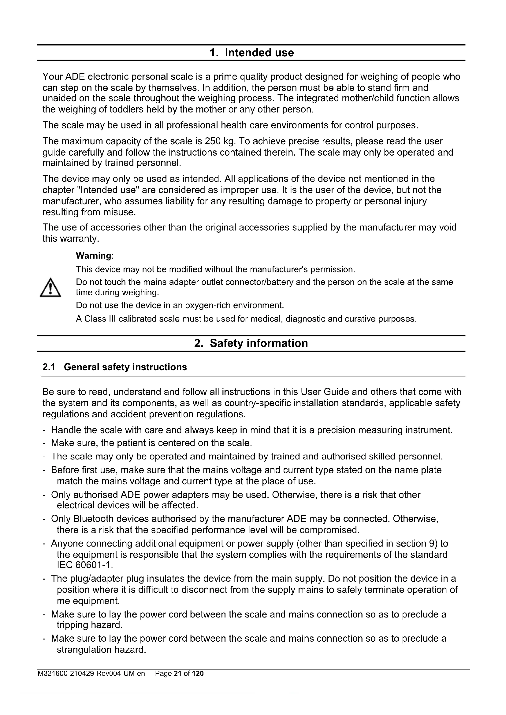 Be sure to read, understand and follow all instructions in this User Guide and others that come with the system and its components, as well as country-specific installation standards, applicable safety regulations and accident prevention regulations. - Handle the scale with care and always keep in mind that it is a precision measuring instrument. - Make sure, the patient is centered on the scale. - The scale may only be operated and maintained by trained and authorised skilled personnel. - Before first use, make sure that the mains voltage and current type stated on the name plate match the mains voltage and current type at the place of use. - Only authorised ADE power adapters may be used. Otherwise, there is a risk that other electrical devices will be affected. - Only Bluetooth devices authorised by the manufacturer ADE may be connected. Otherwise, there is a risk that the specified performance level will be compromised. - Anyone connecting additional equipment or power supply (other than specified in section 9) to the equipment is responsible that the system complies with the requirements of the standard IEC 60601-1. - The plug/adapter plug insulates the device from the main supply. Do not position the device in a position where it is difficult to disconnect from the supply mains to safely terminate operation of me equipment. - Make sure to lay the power cord between the scale and mains connection so as to preclude a tripping hazard. - Make sure to lay the power cord between the scale and mains connection so as to preclude a strangulation hazard.Page 22 of 120 M321600-210429-Rev004-UM-en - Never move the scale back and forth at the place of use as this may cause damage to the load cells. - Operate the device only within the permissible ambient conditions. - Do not expose the scale to high temperatures, whether from neighbouring devices or direct sunlight. The liquid crystal display may suffer damage. - Use the scale at constant ambient temperatures and avoid using in draughts, otherwise the measurement results could be falsified. - After Storage under extreme conditions at least 60 min required until the scale has acclimated and is ready for intended use. - If possible, place the scale away from other devices or sources that generate electromagnetic or other disturbances as these can falsify the measurement results. - Use only approved accessories and peripherals. The use of unauthorised accessories or cables will invalidate the classification of the scale as a medical device. - Before cleaning the device, disconnect the mains adapter from the mains. - Do not immerse the device in water or other liquids. - If the scale will not be used for a long time, it should be cleaned and stored in a protective film. The addition of a drying agent is desirable. - Remove the batteries if you are not going to use the scale for a long time. - If you have any problems with this device, such as setting up, maintaining or using, please contact authorised customer support. Do not open or repair the device by yourself. - Please report authorised customer support if any unexpected operation or events occur. DO NOT use the scale: - If the mains adapter is damaged; - If the mains adapter is not working; - If the battery compartment has an unnatural bulge; - After long storage in a humid environment. In such cases, please contact authorised customer support.M321600-210429-Rev004-UM-en Page 23 of 120