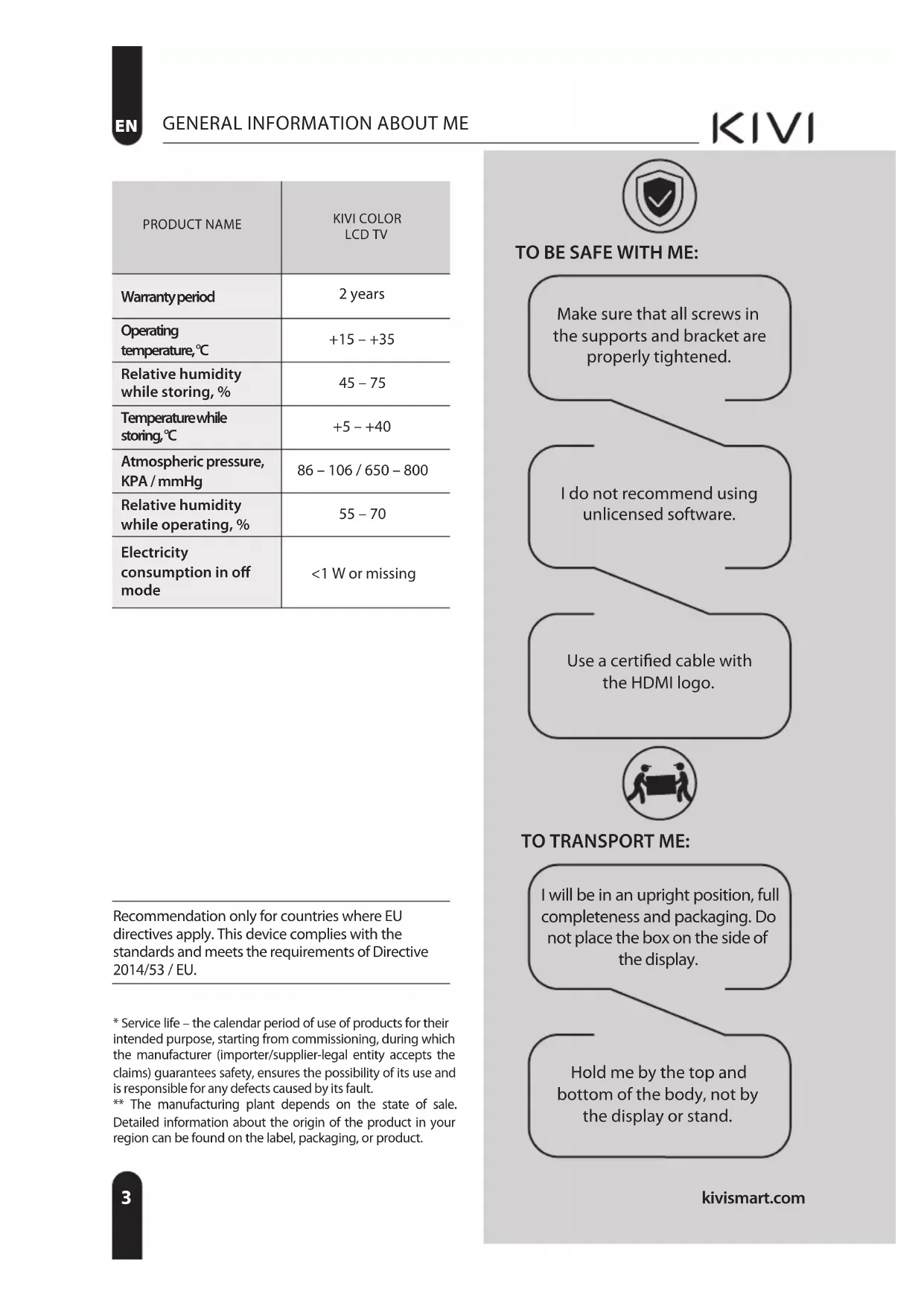 BG* Service life – the calendar period of use of products for their intended purpose, starting from commissioning, during which the manufacturer (importer/supplier-legal entity accepts the claims) guarantees safety, ensures the possibility of its use and is responsible for any defects caused by its fault. ** The manufacturing plant depends on the state of sale. Detailed information about the origin of the product in your region can be found on the label, packaging, or product. Recommendation only for countries where EU directives apply. This device complies with the standards and meets the requirements of Directive 2014/53 / EU. TO TRANSPORT ME: I will be in an upright position, full completeness and packaging. Do not place the box on the side of the display. Hold me by the top and bottom of the body, not by the display or stand. Use a certified cable with the HDMI logo. I do not recommend using unlicensed software. Make sure that all screws in the supports and bracket are properly tightened. TO BE SAFE WITH ME: PRODUCT NAME KIVI COLOR LCD TV Warranty period 2 years Operating temperature, °C +15 – +35 Relative humidity while storing, % 45 – 75 Temperature while storing, °C +5 – +40 Atmospheric pressure, KPA / mmHg 86 – 106 / 650 – 800 Relative humidity while operating, % 55 – 70 Electricity consumption in o mode <1 W or missing