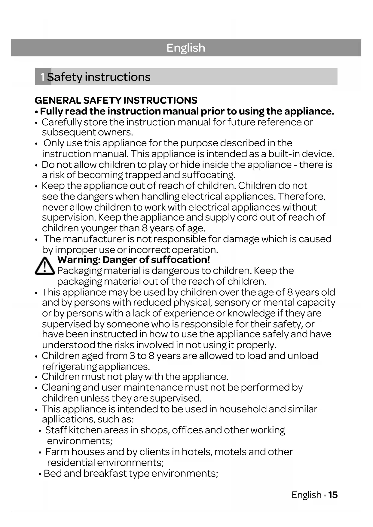 - Do not allow children to play or hide inside the appliance - there is a risk of becoming trapped and suffocating.