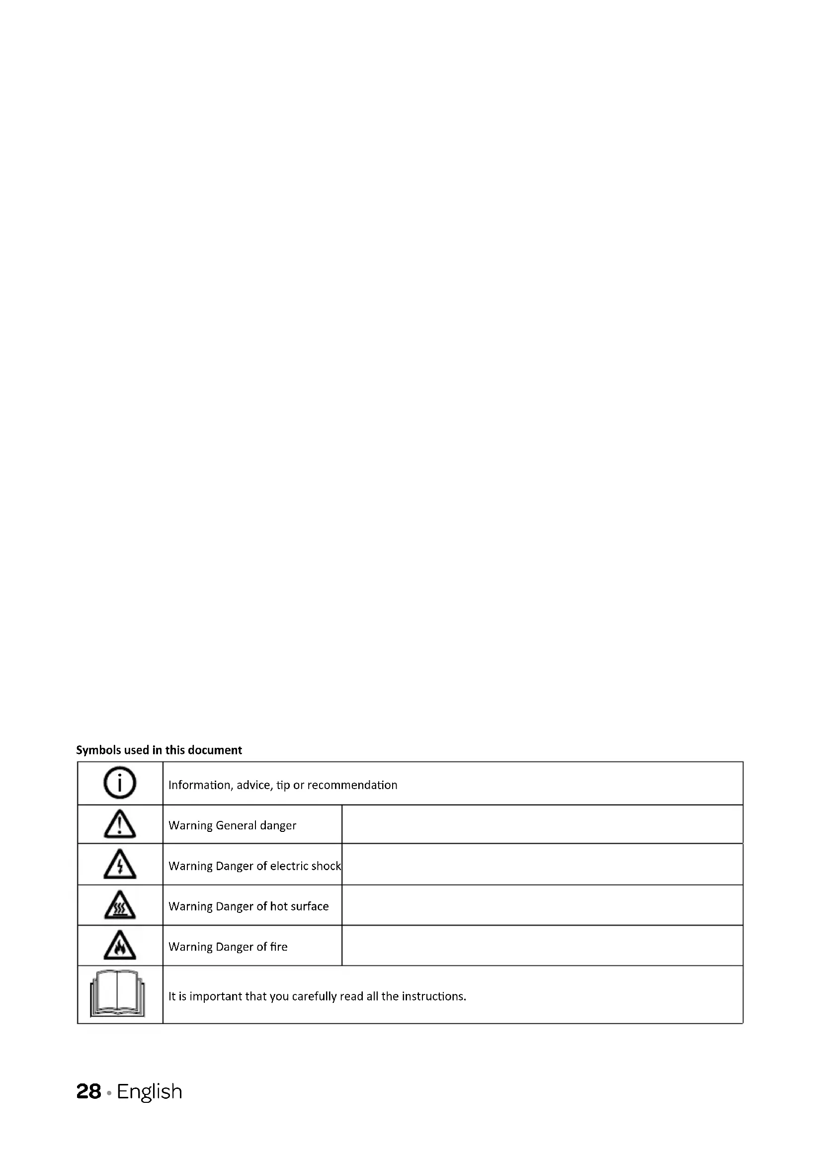 Informaon, advice, p or recommendaon Warning General danger Warning Danger of electric shock Warning Danger of hot surface Warning Danger of re It is important that you carefully read all the instrucons.English • 29