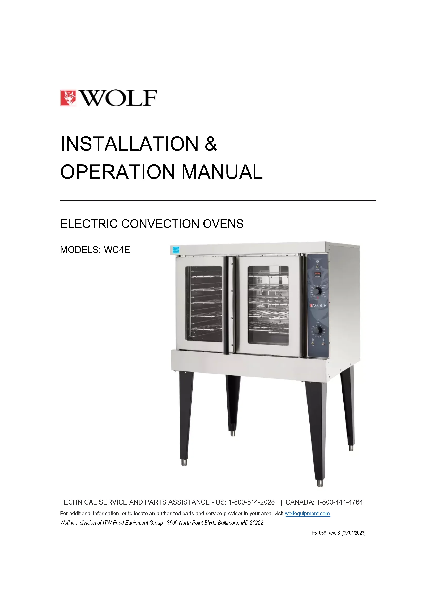 TECHNICAL SERVICE AND PARTS ASSISTANCE - US: 1-800-814-2028 | CANADA: 1-800-444-4764 For additional information, or to locate an authorized parts and service provider in your area, visit wolfequipment.com Wolf is a division of ITW Food Equipment Group | 3600 North Point Blvd., Baltimore, MD 21222 F51058 Rev. B (09/01/2023) INSTALLATION & OPERATION MANUAL