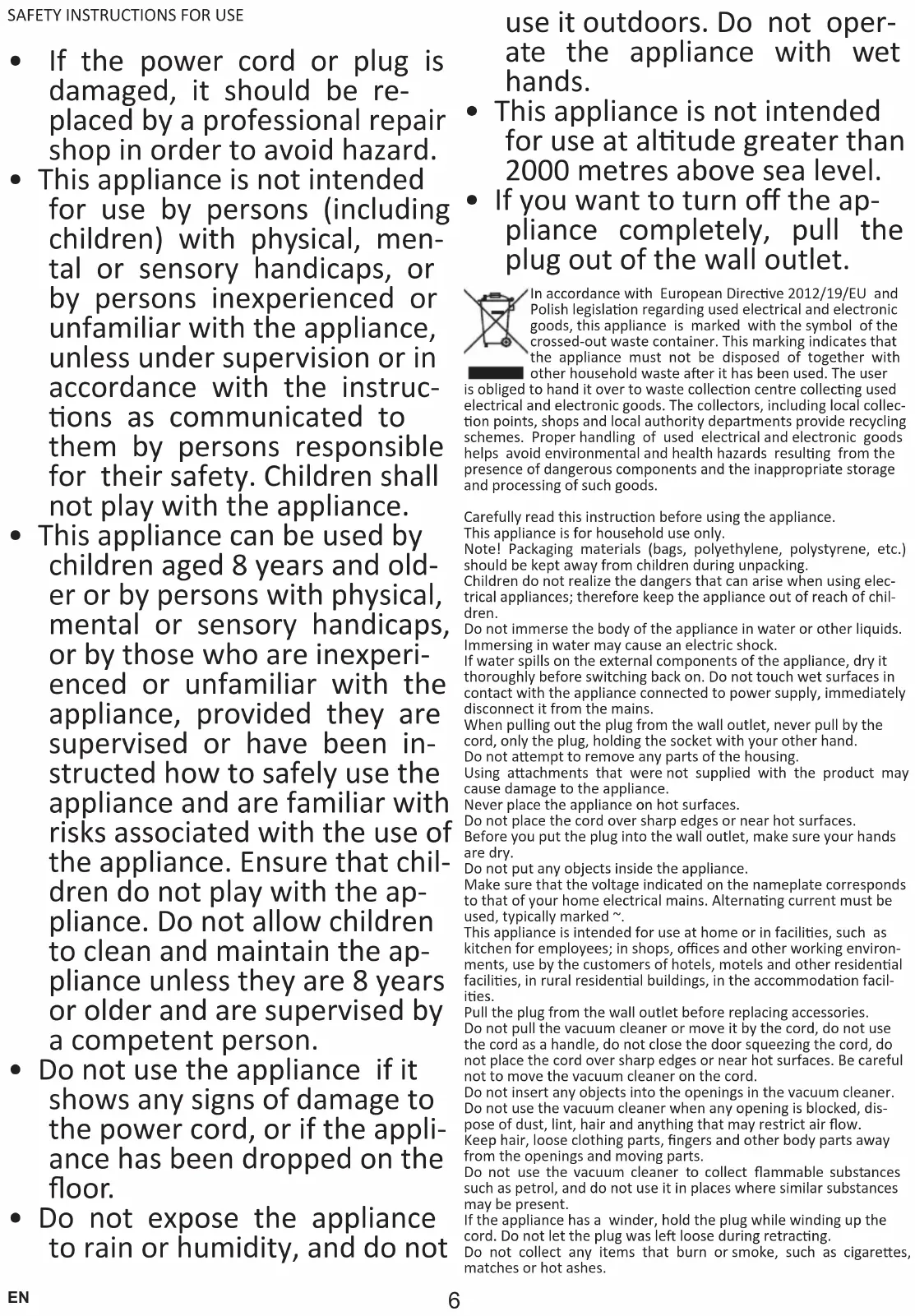 - Do not expose the appliance to rain or humidity, and do not use it outdoors. Do not oper- ate the appliance with wet hands.