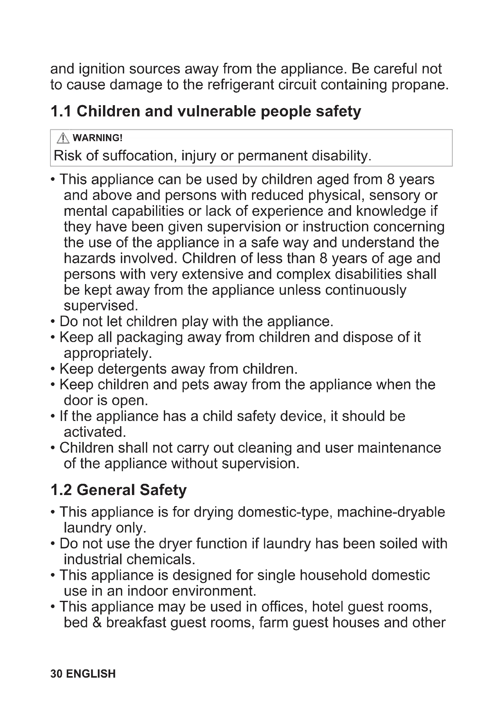 The appliance contains flammable gas, propane (R290), a gas with a high level of environmental compatibility. Keep fire ENGLISH 29and ignition sources away from the appliance. Be careful not to cause damage to the refrigerant circuit containing propane.