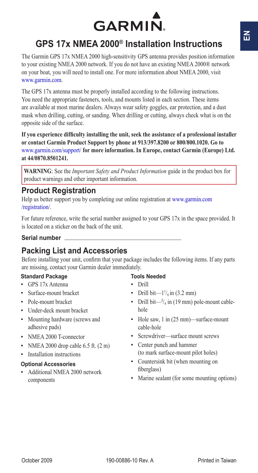 The GPS 17x antenna must be properly installed according to the following instructions. You need the appropriate fasteners, tools, and mounts listed in each section. These items are available at most marine dealers. Always wear safety goggles, ear protection, and a dust mask when drilling, cutting, or sanding. When drilling or cutting, always check what is on the opposite side of the surface. If you experience difficulty installing the unit, seek the assistance of a professional installer or contact Garmin Product Support by phone at 913/397.8200 or 800/800.1020. Go to www.garmin.com/support/ for more information. In Europe, contact Garmin (Europe) Ltd. at 44/0870.8501241. WARNING: See the Important Safety and Product Information guide in the product box for product warnings and other important information.