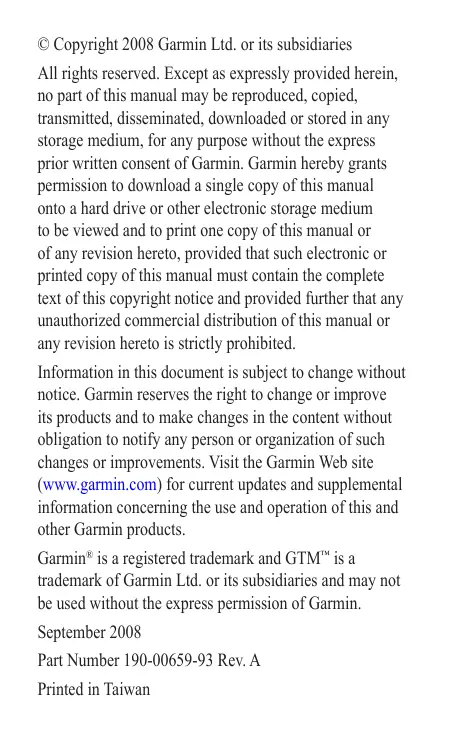 All rights reserved. Except as expressly provided herein, no part of this manual may be reproduced, copied, transmitted, disseminated, downloaded or stored in any storage medium, for any purpose without the express prior written consent of Garmin. Garmin hereby grants permission to download a single copy of this manual onto a hard drive or other electronic storage medium to be viewed and to print one copy of this manual or of any revision hereto, provided that such electronic or printed copy of this manual must contain the complete text of this copyright notice and provided further that any unauthorized commercial distribution of this manual or any revision hereto is strictly prohibited. Information in this document is subject to change without notice. Garmin reserves the right to change or improve its products and to make changes in the content without obligation to notify any person or organization of such changes or improvements. Visit the Garmin Web site (www.garmin.com) for current updates and supplemental information concerning the use and operation of this and other Garmin products. Garmin® is a registered trademark and GTM™ is a trademark of Garmin Ltd. or its subsidiaries and may not be used without the express permission of Garmin. September 2008 Part Number 190-00659-93 Rev. A Printed in Taiwan