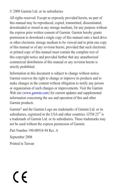 © 2008 Garmin Ltd. or its subsidiaries All rights reserved. Except as expressly provided herein, no part of this manual may be reproduced, copied, transmitted, disseminated, downloaded or stored in any storage medium, for any purpose without the express prior written consent of Garmin. Garmin hereby grants permission to download a single copy of this manual onto a hard drive or other electronic storage medium to be viewed and to print one copy of this manual or of any revision hereto, provided that such electronic or printed copy of this manual must contain the complete text of this copyright notice and provided further that any unauthorized commercial distribution of this manual or any revision hereto is strictly prohibited. Information in this document is subject to change without notice. Garmin reserves the right to change or improve its products and to make changes in the content without obligation to notify any person or organization of such changes or improvements. Visit the Garmin Web site (www.garmin.com) for current updates and supplemental information concerning the use and operation of this and other Garmin products. Garmin® and the Garmin Logo are trademarks of Garmin Ltd. or its subsidiaries, registered in the USA and other countries. GTM 25™ is a trademark of Garmin Ltd. or its subsidiaries. These trademarks may not be used without the express permission of Garmin. Part Number 190-00918-94 Rev. A September 2008 Printed in Taiwan
