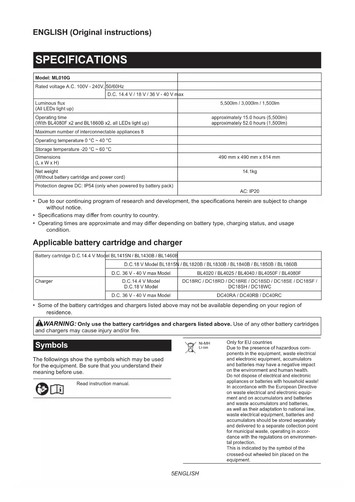 and chargers may cause injury and/or re. Symbols The followings show the symbols which may be used for the equipment. Be sure that you understand their meaning before use. Read instruction manual. Ni-MH Li-ion Only for EU countries Due to the presence of hazardous com- ponents in the equipment, waste electrical and electronic equipment, accumulators and batteries may have a negative impact on the environment and human health. Do not dispose of electrical and electronic appliances or batteries with household waste! In accordance with the European Directive on waste electrical and electronic equip- ment and on accumulators and batteries and waste accumulators and batteries, as well as their adaptation to national law, waste electrical equipment, batteries and accumulators should be stored separately and delivered to a separate collection point for municipal waste, operating in accor- dance with the regulations on environmen- tal protection. This is indicated by the symbol of the crossed-out wheeled bin placed on the equipment.6 ENGLISH Take particular care and attention.Optical Radiation (UV and IR).Minimize exposure to eyes or skin.Do not stare at operating lamp.Use appropriate shielding or eyes protection.Do not use the appliance in the rain, snow, humid or wet condition when using with AC power.Breaker restart button. Remark This product contains light sources of energy eciency class <C> and <D>. Power supply The tool should be connected only to a power supply of the same voltage as indicated on the nameplate, and can only be operated on single-phase AC supply. This tool should be grounded while in use to protect the operator from electric shock. Use only three-wire extension cords which have three-prong grounding-type plugs and three-pole receptacles which accept the tool's plug. SAFETY WARNINGS IMPORTANT SAFETY INSTRUCTIONS