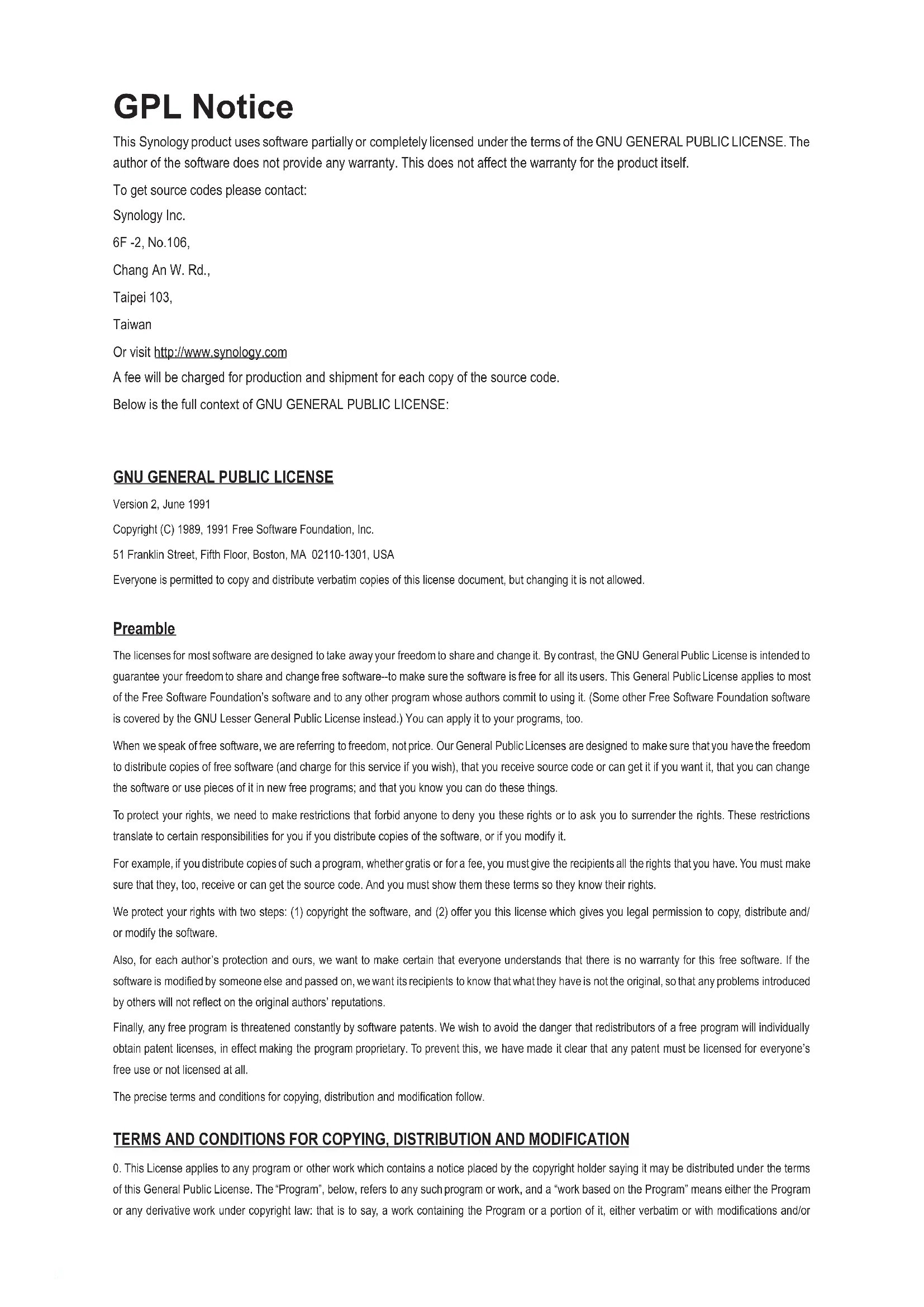 8This Synology product uses software partially or completely licensed under the terms of the GNU GENERAL PUBLIC LICENSE. The author of the software does not provide any warranty. This does not affect the warranty for the product itself. To get source codes please contact: Synology Inc. 6F -2, No.106, Chang An W. Rd., Taipei 103, Taiwan Or visit http://www.synology.com A fee will be charged for production and shipment for each copy of the source code. Below is the full context of GNU GENERAL PUBLIC LICENSE: