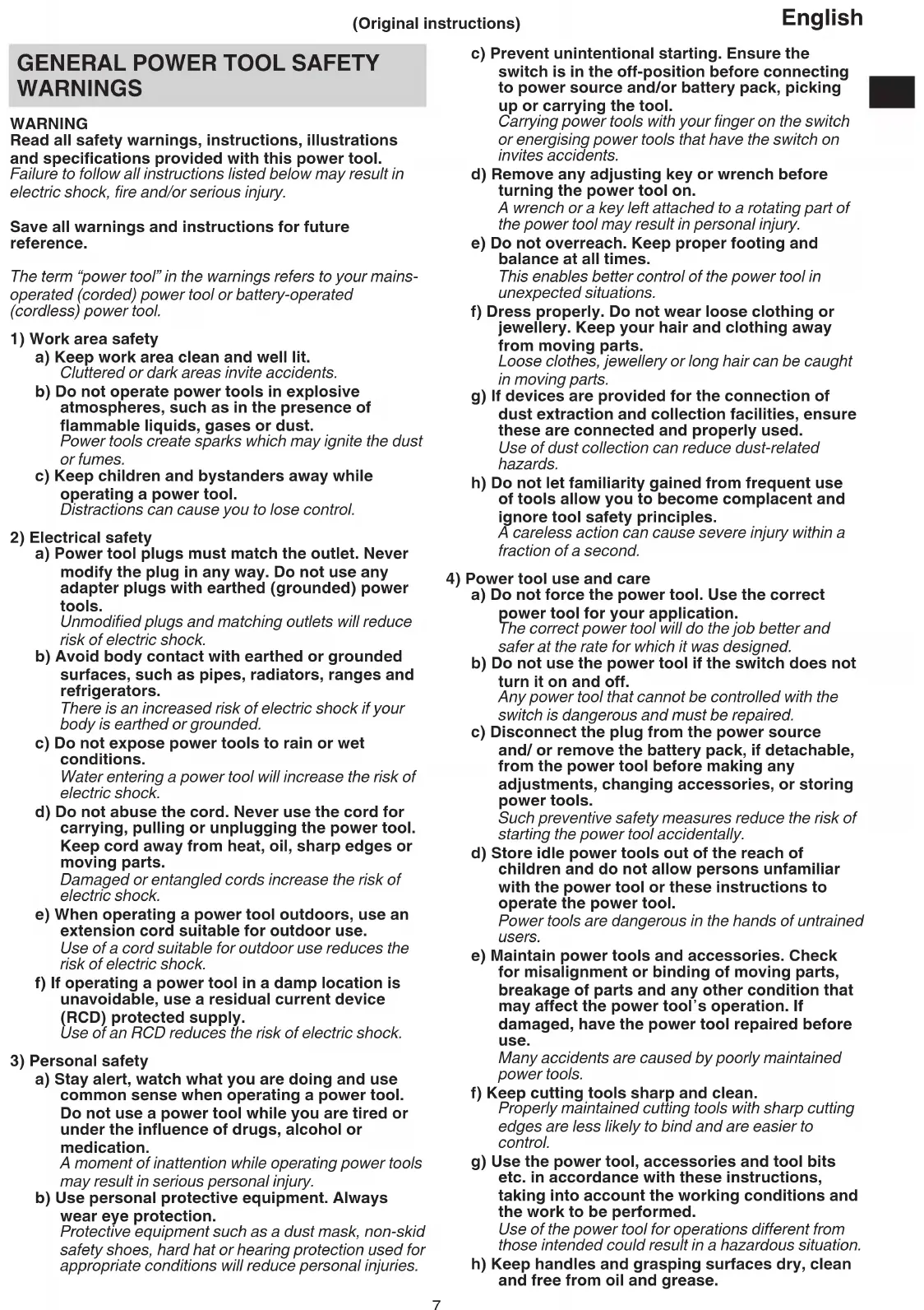 a) Do not force the power tool. Use the correct power tool for your application. The correct power tool will do the job better and safer at the rate for which it was designed. b) Do not use the power tool if the switch does not turn it on and off. Any power tool that cannot be controlled with the switch is dangerous and must be repaired. c) Disconnect the plug from the power source and/ or remove the battery pack, if detachable, from the power tool before making any adjustments, changing accessories, or storing power tools. Such preventive safety measures reduce the risk of starting the power tool accidentally. d) Store idle power tools out of the reach of children and do not allow persons unfamiliar with the power tool or these instructions to operate the power tool. Power tools are dangerous in the hands of untrained users. e) Maintain power tools and accessories. Check for misalignment or binding of moving parts, breakage of parts and any other condition that may affect the power toolʼs operation. If damaged, have the power tool repaired before use. Many accidents are caused by poorly maintained power tools. f) Keep cutting tools sharp and clean. Properly maintained cutting tools with sharp cutting edges are less likely to bind and are easier to control. g) Use the power tool, accessories and tool bits etc. in accordance with these instructions, taking into account the working conditions and the work to be performed. Use of the power tool for operations different from those intended could result in a hazardous situation. h) Keep handles and grasping surfaces dry, clean and free from oil and grease. 2023/07/20 17:28:42Stylesheet: EU Version: 2023.6.21 H3641DA_C99749471_308_EUEnglish