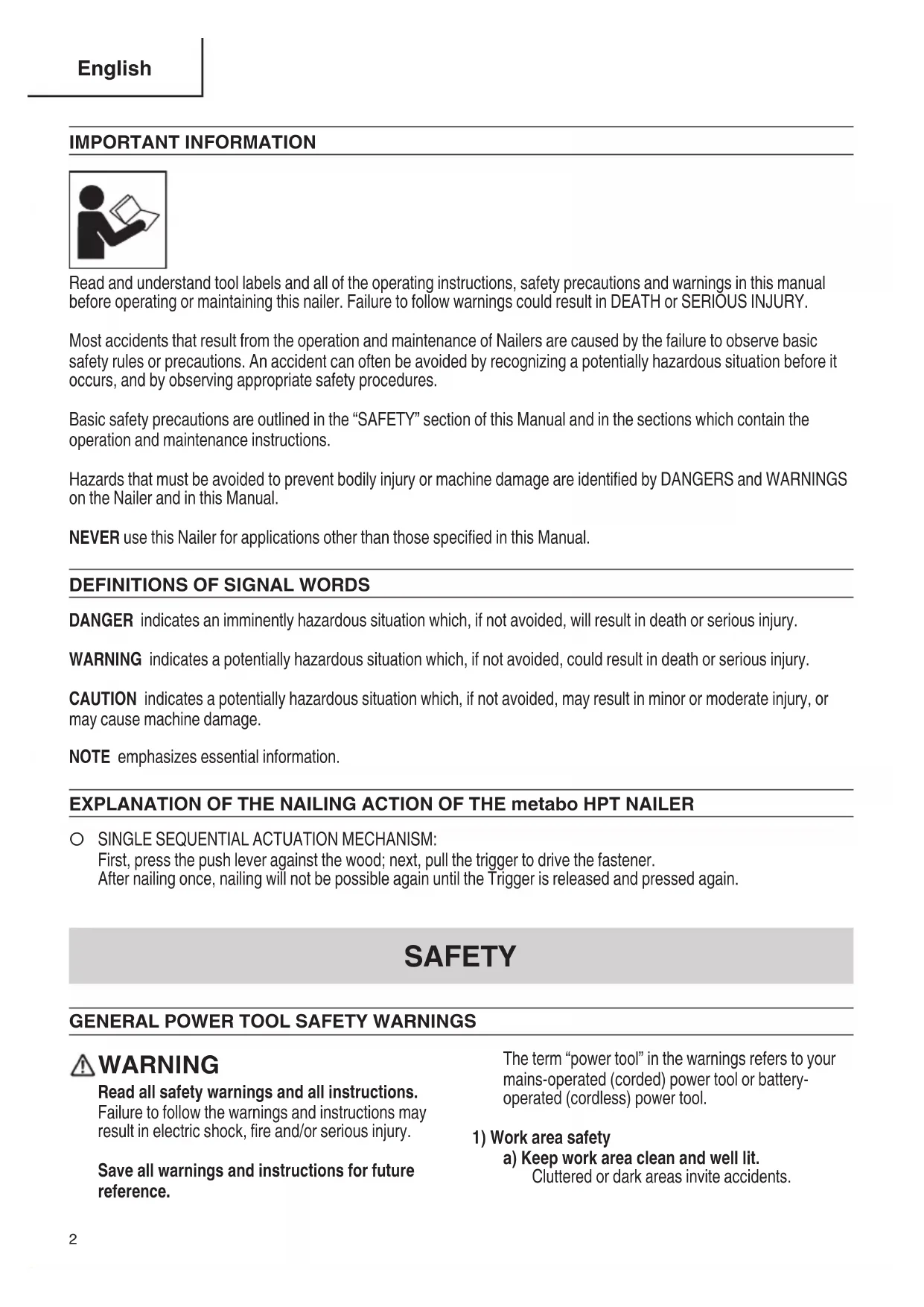 DANGER indicates an imminently hazardous situation which, if not avoided, will result in death or serious injury. WARNING indicates a potentially hazardous situation which, if not avoided, could result in death or serious injury. CAUTION indicates a potentially hazardous situation which, if not avoided, may result in minor or moderate injury, or may cause machine damage. NOTE emphasizes essential information. EXPLANATION OF THE NAILING ACTION OF THE metabo HPT NAILER