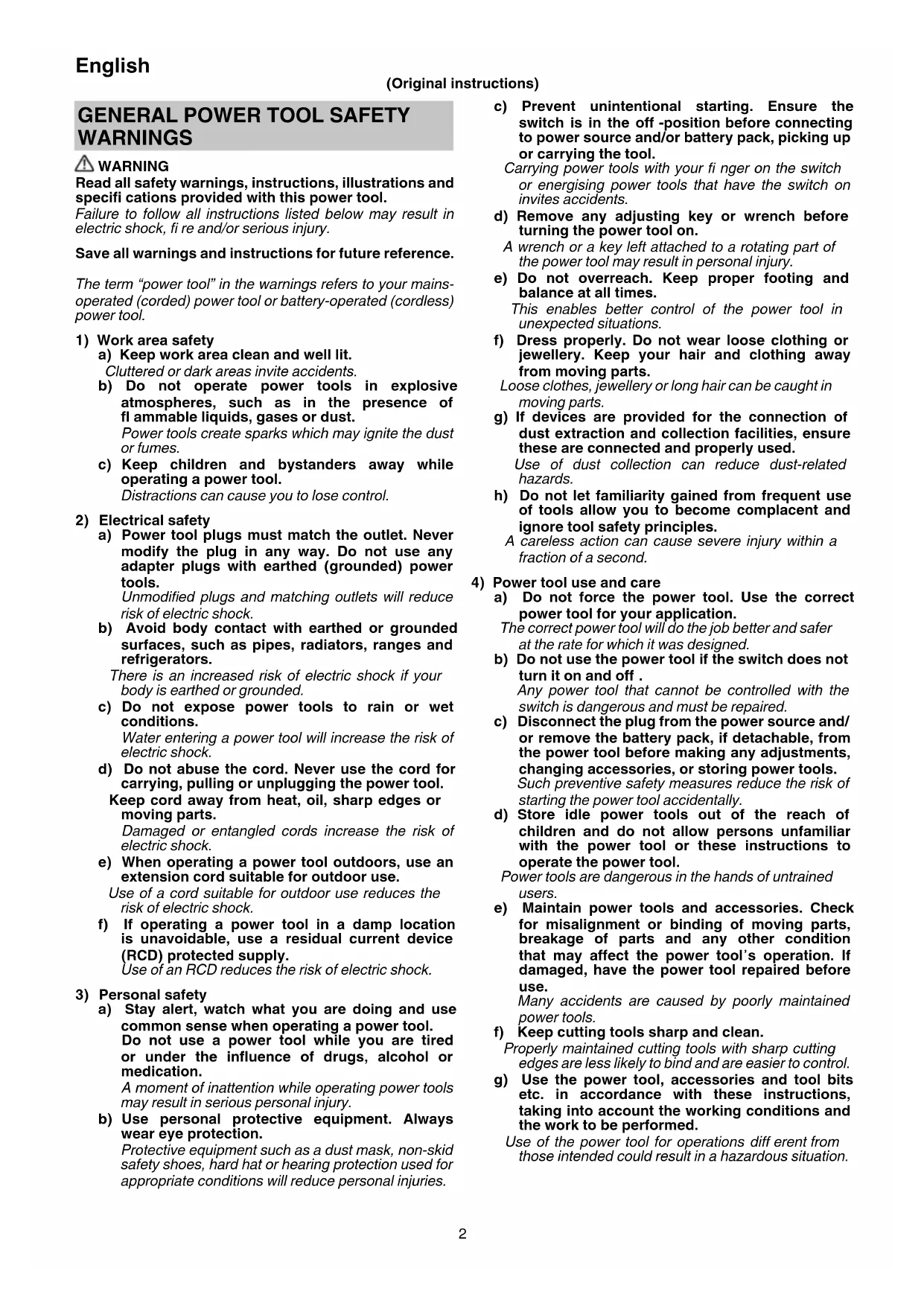 a) Do not force the power tool. Use the correct power tool for your application. The correct power tool will do the job better and safer at the rate for which it was designed. b) Do not use the power tool if the switch does not turn it on and off . Any power tool that cannot be controlled with the switch is dangerous and must be repaired. c) Disconnect the plug from the power source and/ or remove the battery pack, if detachable, from the power tool before making any adjustments, changing accessories, or storing power tools. Such preventive safety measures reduce the risk of starting the power tool accidentally. d) Store idle power tools out of the reach of children and do not allow persons unfamiliar with the power tool or these instructions to operate the power tool. Power tools are dangerous in the hands of untrained users. e) Maintain power tools and accessories. Check for misalignment or binding of moving parts, breakage of parts and any other condition that may aff ect the power toolʼs operation. If damaged, have the power tool repaired before use. Many accidents are caused by poorly maintained power tools. f) Keep cutting tools sharp and clean. Properly maintained cutting tools with sharp cutting edges are less likely to bind and are easier to control. g) Use the power tool, accessories and tool bits etc. in accordance with these instructions, taking into account the working conditions and the work to be performed. Use of the power tool for operations diff erent from those intended could result in a hazardous situation.