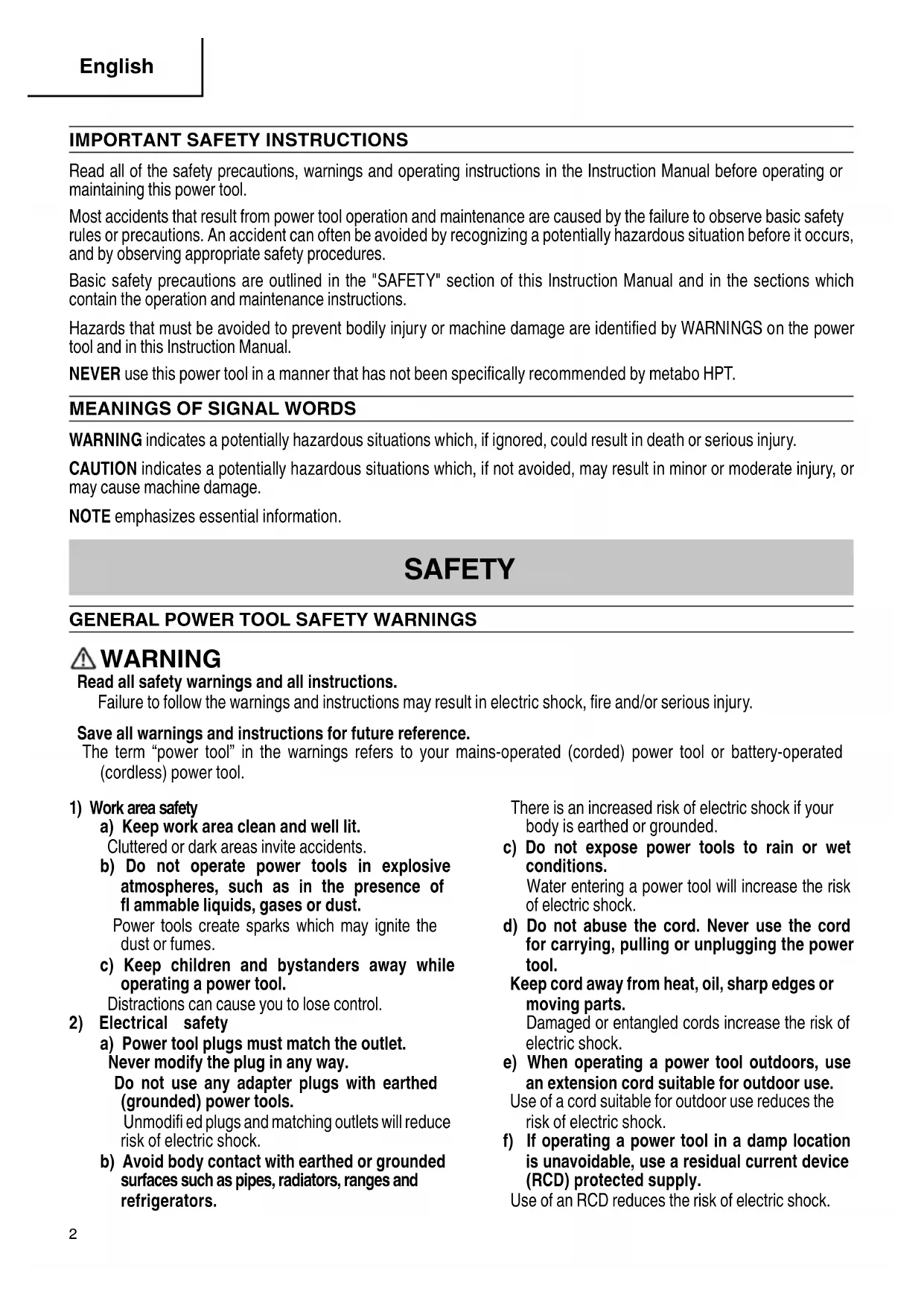 Read all of the safety precautions, warnings and operating instructions in the Instruction Manual before operating or maintaining this power tool. Most accidents that result from power tool operation and maintenance are caused by the failure to observe basic safety rules or precautions. An accident can often be avoided by recognizing a potentially hazardous situation before it occurs, and by observing appropriate safety procedures. Basic safety precautions are outlined in the "SAFETY" section of this Instruction Manual and in the sections which contain the operation and maintenance instructions. Hazards that must be avoided to prevent bodily injury or machine damage are identifi ed by WARNINGS on the power tool and in this Instruction Manual. NEVER use this power tool in a manner that has not been specifi cally recommended by metabo HPT.