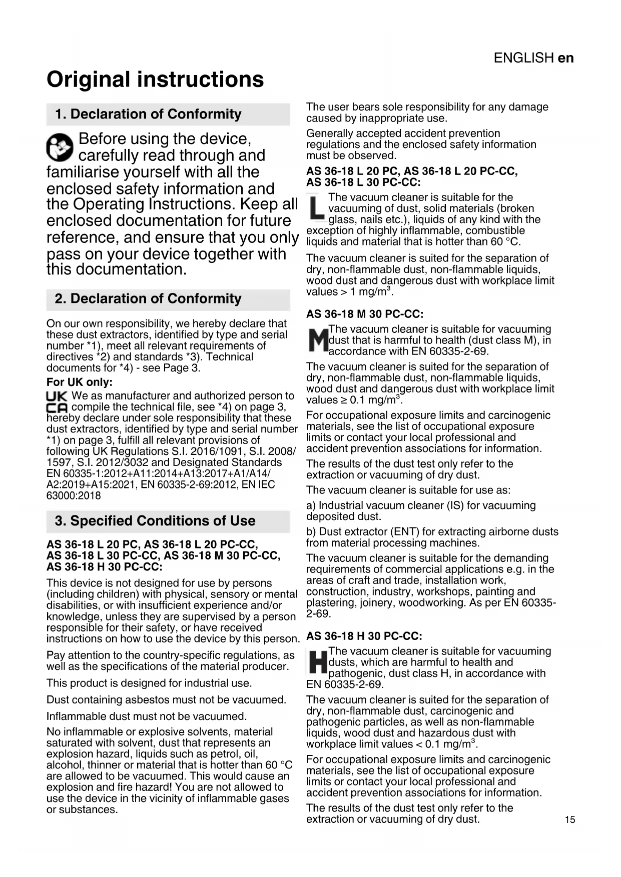 Original instructions Before using the device, carefully read through and familiarise yourself with all the enclosed safety information and the Operating Instructions. Keep all enclosed documentation for future reference, and ensure that you only pass on your device together with this documentation. On our own responsibility, we hereby declare that these dust extractors, identified by type and serial number *1), meet all relevant requirements of directives *2) and standards *3). Technical documents for *4) - see Page 3. For UK only: We as manufacturer and authorized person to compile the technical file, see *4) on page 3, hereby declare under sole responsibility that these dust extractors, identified by type and serial number *1) on page 3, fulfill all relevant provisions of following UK Regulations S.I. 2016/1091, S.I. 2008/ 1597, S.I. 2012/3032 and Designated Standards EN 60335-1:2012+A11:2014+A13:2017+A1/A14/ A2:2019+A15:2021, EN 60335-2-69:2012, EN IEC 63000:2018 AS 36-18 L 20 PC, AS 36-18 L 20 PC-CC, AS 36-18 L 30 PC-CC, AS 36-18 M 30 PC-CC, AS 36-18 H 30 PC-CC: This device is not designed for use by persons (including children) with physical, sensory or mental disabilities, or with insufficient experience and/or knowledge, unless they are supervised by a person responsible for their safety, or have received instructions on how to use the device by this person. Pay attention to the country-specific regulations, as well as the specifications of the material producer. This product is designed for industrial use. Dust containing asbestos must not be vacuumed. Inflammable dust must not be vacuumed. No inflammable or explosive solvents, material saturated with solvent, dust that represents an explosion hazard, liquids such as petrol, oil, alcohol, thinner or material that is hotter than 60 °C are allowed to be vacuumed. This would cause an explosion and fire hazard! You are not allowed to use the device in the vicinity of inflammable gases or substances. The user bears sole responsibility for any damage caused by inappropriate use. Generally accepted accident prevention regulations and the enclosed safety information must be observed. AS 36-18 L 20 PC, AS 36-18 L 20 PC-CC, AS 36-18 L 30 PC-CC: The vacuum cleaner is suitable for the vacuuming of dust, solid materials (broken glass, nails etc.), liquids of any kind with the exception of highly inflammable, combustible liquids and material that is hotter than 60 °C. The vacuum cleaner is suited for the separation of dry, non-flammable dust, non-flammable liquids, wood dust and dangerous dust with workplace limit values > 1 mg/m³. AS 36-18 M 30 PC-CC: The vacuum cleaner is suitable for vacuuming dust that is harmful to health (dust class M), in accordance with EN 60335-2-69. The vacuum cleaner is suited for the separation of dry, non-flammable dust, non-flammable liquids, wood dust and dangerous dust with workplace limit values ≥ 0.1 mg/m³. For occupational exposure limits and carcinogenic materials, see the list of occupational exposure limits or contact your local professional and accident prevention associations for information. The results of the dust test only refer to the extraction or vacuuming of dry dust. The vacuum cleaner is suitable for use as: a) Industrial vacuum cleaner (IS) for vacuuming deposited dust. b) Dust extractor (ENT) for extracting airborne dusts from material processing machines. The vacuum cleaner is suitable for the demanding requirements of commercial applications e.g. in the areas of craft and trade, installation work, construction, industry, workshops, painting and plastering, joinery, woodworking. As per EN 60335- 2-69. AS 36-18 H 30 PC-CC: The vacuum cleaner is suitable for vacuuming dusts, which are harmful to health and pathogenic, dust class H, in accordance with EN 60335-2-69. The vacuum cleaner is suited for the separation of dry, non-flammable dust, carcinogenic and pathogenic particles, as well as non-flammable liquids, wood dust and hazardous dust with workplace limit values < 0.1 mg/m³. For occupational exposure limits and carcinogenic materials, see the list of occupational exposure limits or contact your local professional and accident prevention associations for information. The results of the dust test only refer to the extraction or vacuuming of dry dust.