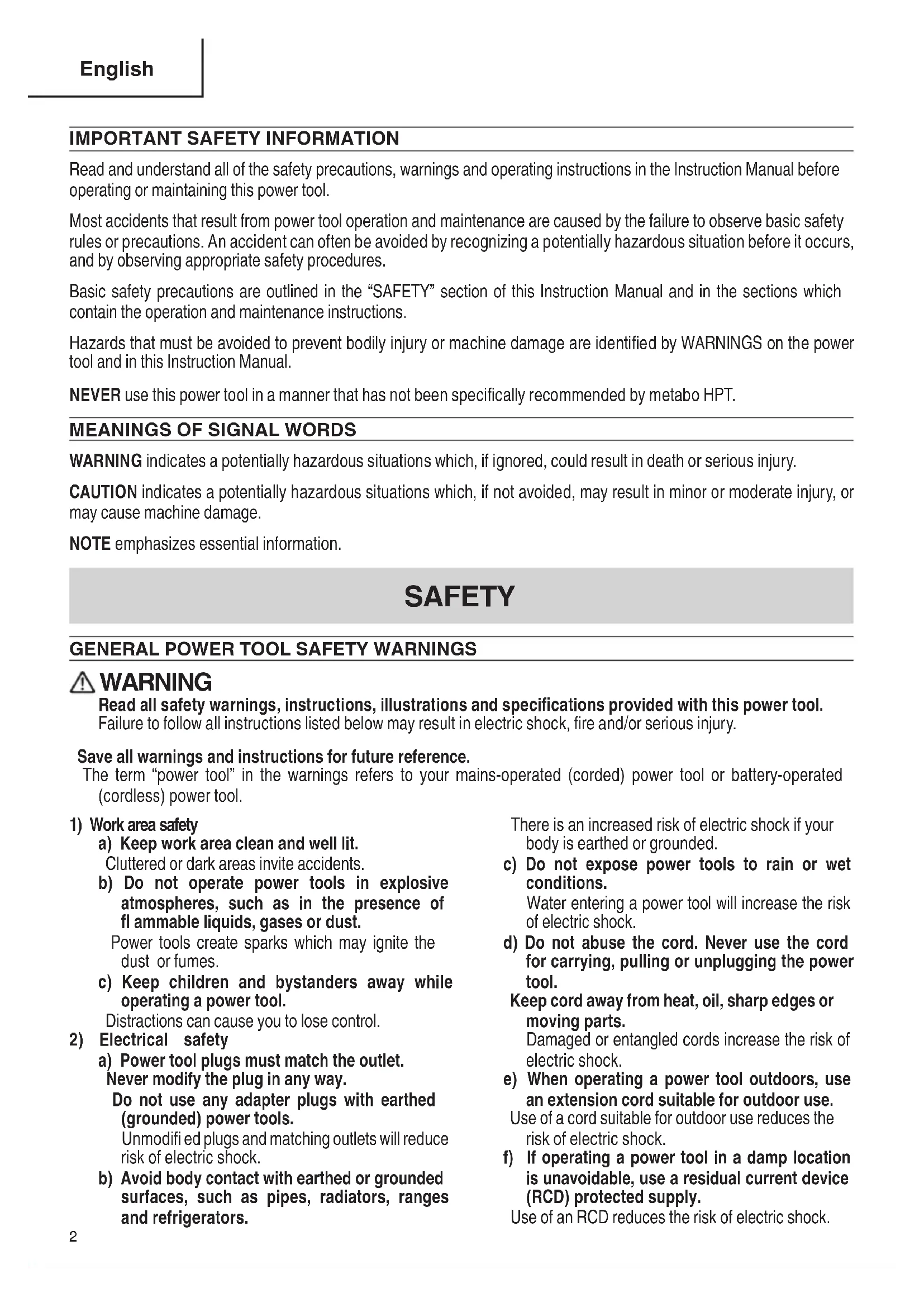 All quality power tools will eventually require servicing or replacement of parts because of wear from normal use. To assure that only authorized replacement parts will be used, all service and repairs must be performed by a metabo HPT AUTHORIZED SERVICE CENTER, ONLY. CAUTION In the operation and maintenance of power tools, the safety regulations and standards prescribed in each country must be observed. Important notice on the batteries for the metabo HPT cordless power tools Please always use one of our designated genuine batteries. We cannot guarantee the safety and performance of our cordless power tool when used with batteries other than these designated by us, or when the battery is disassembled and modifi ed (such as disassembly and replacement of cells or other internal parts).