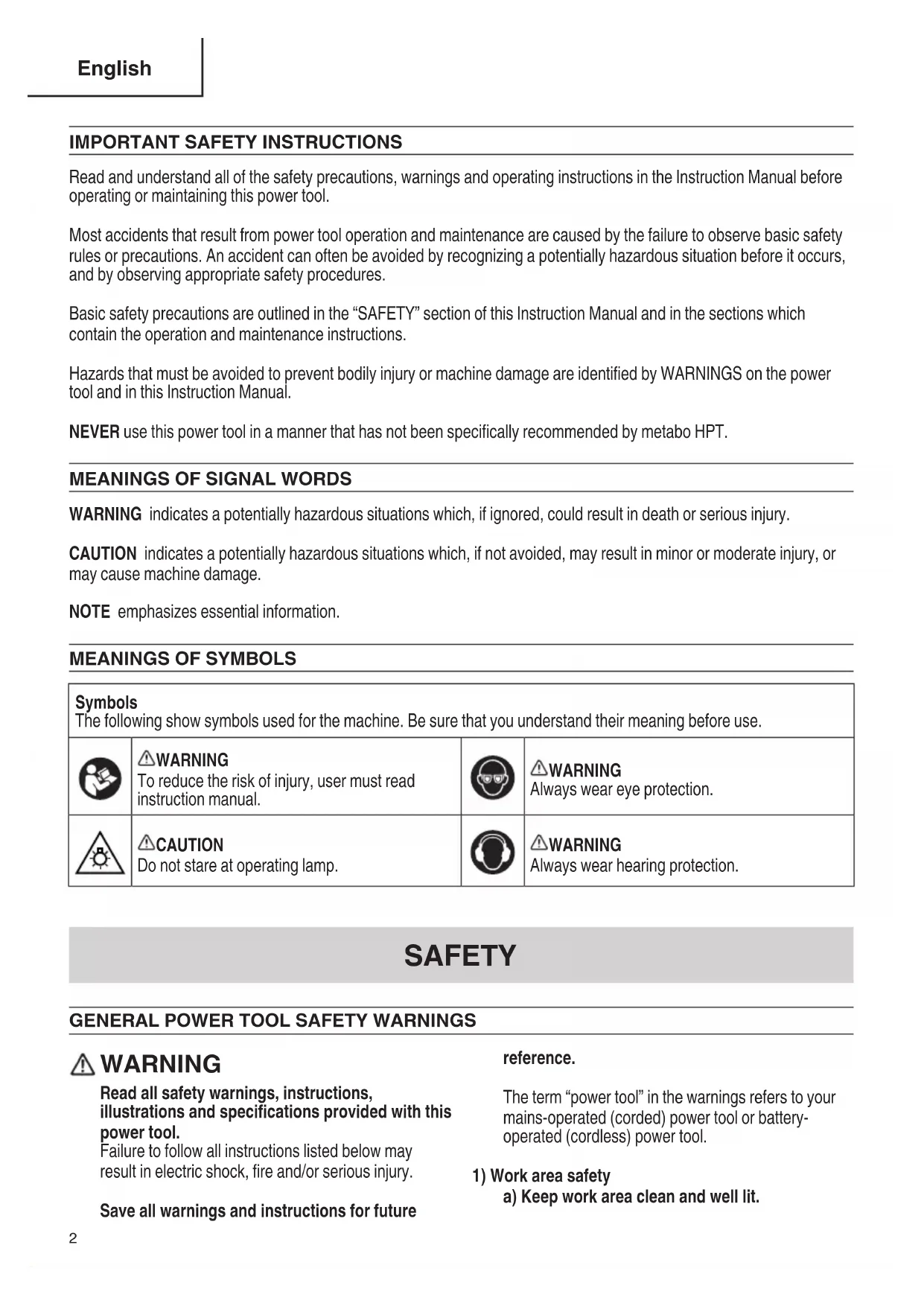 Read and understand all of the safety precautions, warnings and operating instructions in the Instruction Manual before operating or maintaining this power tool. Most accidents that result from power tool operation and maintenance are caused by the failure to observe basic safety rules or precautions. An accident can often be avoided by recognizing a potentially hazardous situation before it occurs, and by observing appropriate safety procedures. Basic safety precautions are outlined in the “SAFETY” section of this Instruction Manual and in the sections which contain the operation and maintenance instructions. Hazards that must be avoided to prevent bodily injury or machine damage are identified by WARNINGS on the power tool and in this Instruction Manual. NEVER use this power tool in a manner that has not been specifically recommended by metaboHPT.
