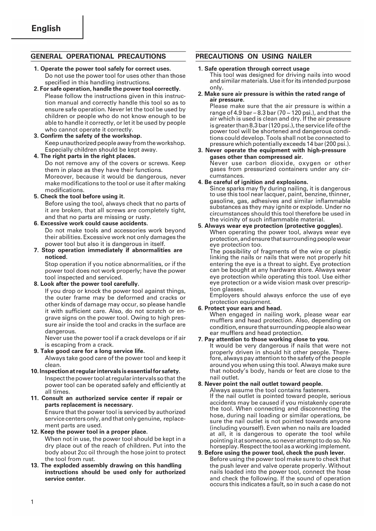 CAUTIONS: 䡬 Never use the head or body of this nailer as a hammer. 䡬 Take precautions to ensure the safety of persons in the vicinity during operation.