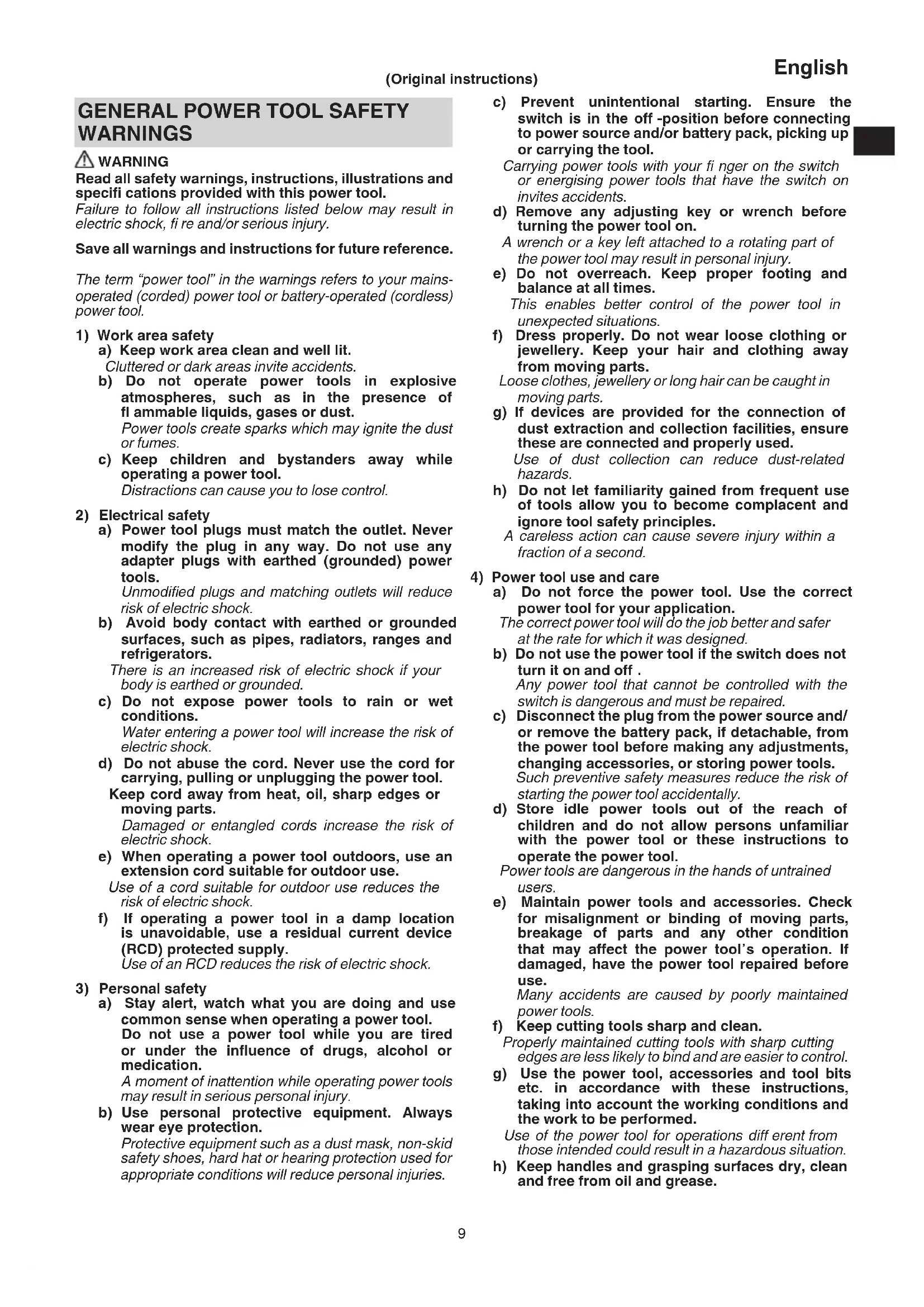 a) Stay alert, watch what you are doing and use common sense when operating a power tool. Do not use a power tool while you are tired or under the infl uence of drugs, alcohol or medication. A moment of inattention while operating power tools may result in serious personal injury. b) Use personal protective equipment. Always wear eye protection. Protective equipment such as a dust mask, non-skid safety shoes, hard hat or hearing protection used for appropriate conditions will reduce personal injuries. (Original instructions) 0000BookC6MEY2.indb90000BookC6MEY2.indb9 2022/11/1516:14:192022/11/1516:14:1910 English Slippery handles and grasping surfaces do not allow for safe handling and control of the tool in unexpected situations.