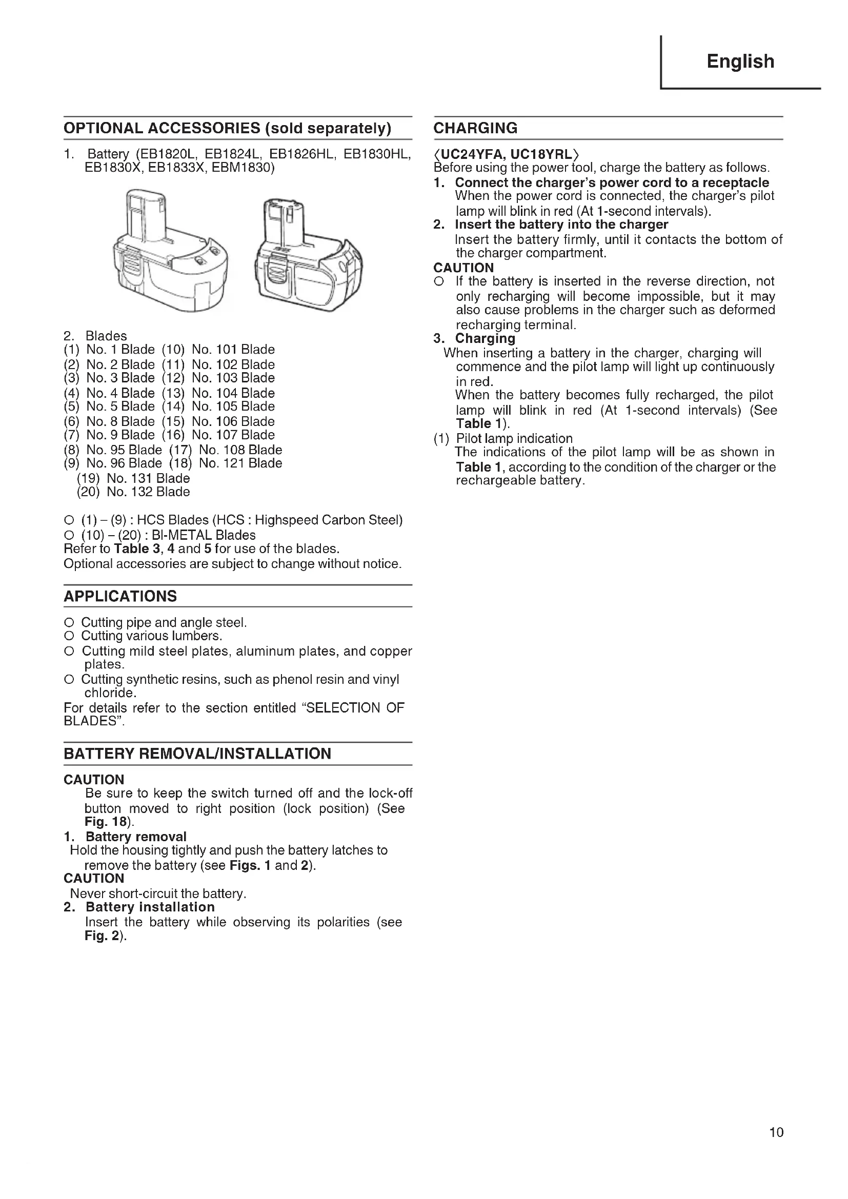 (1) No. 1 Blade (10) No. 101 Blade (2) No. 2 Blade (11) No. 102 Blade (3) No. 3 Blade (12) No. 103 Blade (4) No. 4 Blade (13) No. 104 Blade (5) No. 5 Blade (14) No. 105 Blade (6) No. 8 Blade (15) No. 106 Blade (7) No. 9 Blade (16) No. 107 Blade (8) No. 95 Blade (17) No. 108 Blade (9) No. 96 Blade (18) No. 121 Blade (19) No. 131 Blade (20) No. 132 Blade ○ (1) – (9) : HCS Blades (HCS : Highspeed Carbon Steel) ○ (10) – (20) : Bl-METAL Blades Refer to Table 3, 4 and 5 for use of the blades. Optional accessories are subject to change without notice. APPLICATIONS ○ Cutting pipe and angle steel. ○ Cutting various lumbers. ○ Cutting mild steel plates, aluminum plates, and copper plates. ○ Cutting synthetic resins, such as phenol resin and vinyl chloride. For details refer to the section entitled “SELECTION OF BLADES”.