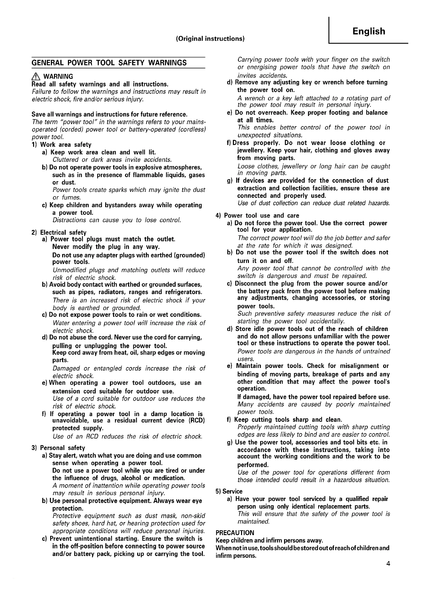 a) Have your power tool serviced by a qualified repair person using only identical replacement parts. This will ensure that the safety of the power tool is maintained. PRECAUTION Keep children and infirm persons away. When not in use, tools should be stored out of reach of children and infirm persons. (Original instructions) 01Eng_H45SR_WE 12/17/09, 4:29 PM45 English