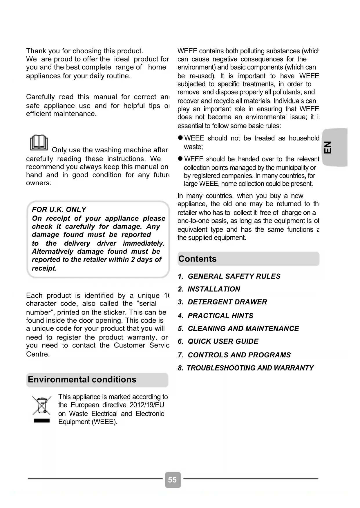 On receipt of your appliance please check it carefully for damage. Any damage found must be reported to the delivery driver immediately. Alternatively damage found must be reported to the retailer within 2 days of receipt. Environmental conditions Contents!