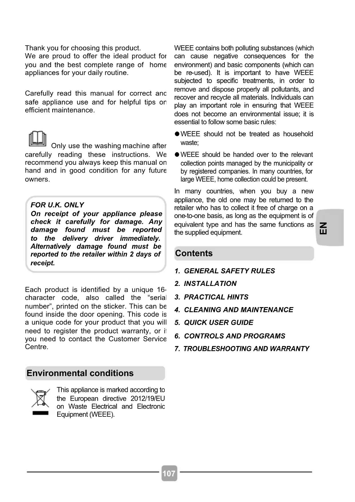 Only use the washing machine after carefully reading these instructions. We recommend you always keep this manual on hand and in good condition for any future owners.