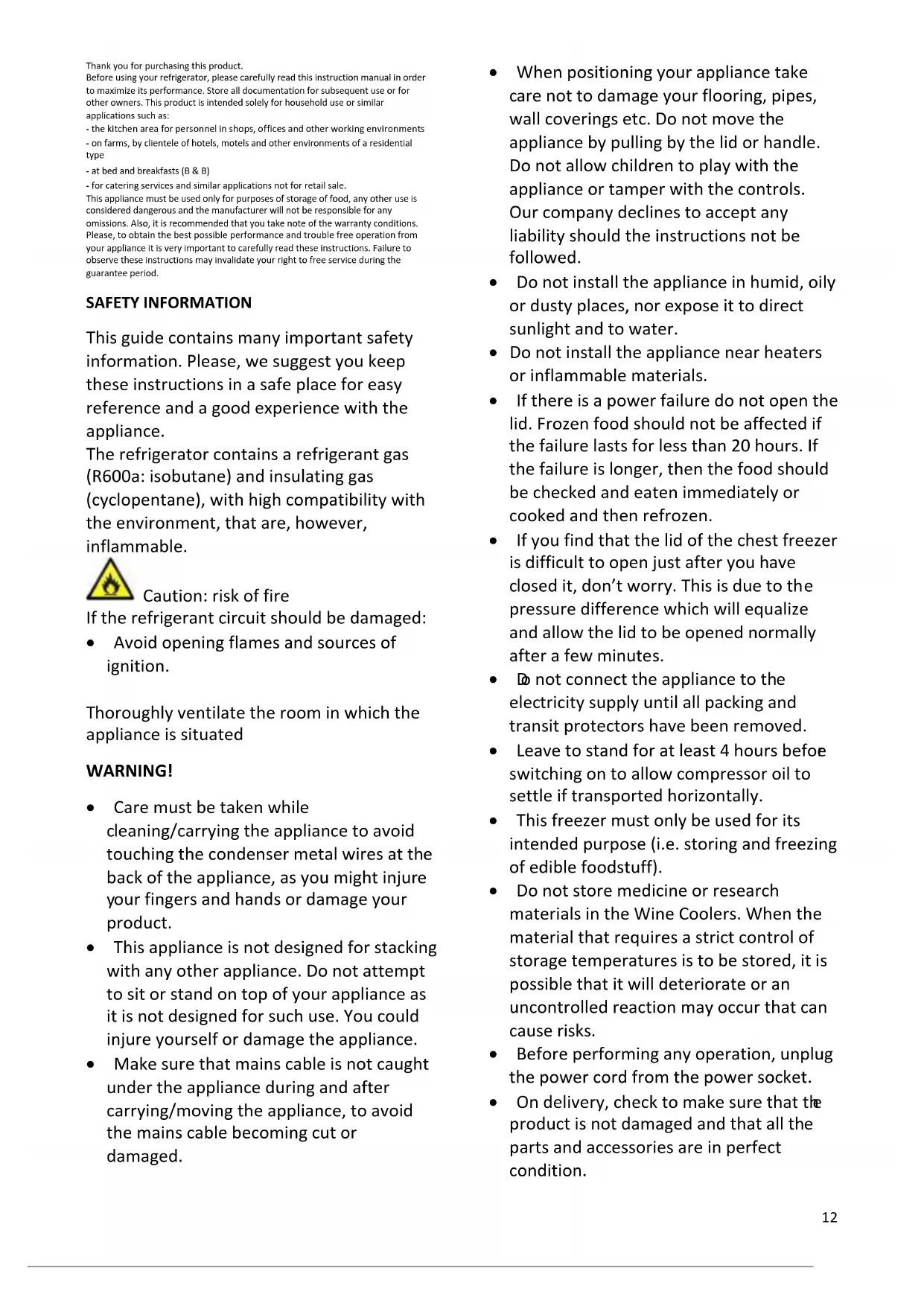 - Do not dispose of the appliance on a fire. Take care not to damage, the cooling circuit/pipes of the appliance in transportation and in use. In case of damage do not expose the appliance to fire, potential ignition source and immediately ventilate the room where the appliance is situated.