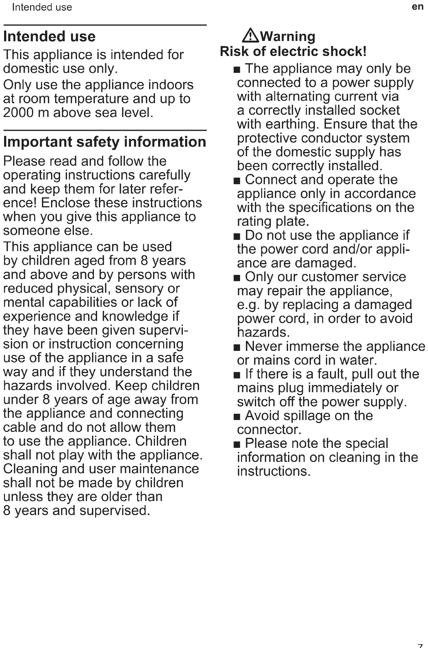 Intendeduse Intended use This appliance is intended for domestic use only. Only use the appliance indoors at room temperature and up to 2000 m above sea level. Important safety information Please read and follow the operating instructions carefully and keep them for later refer- ence! Enclose these instructions when you give this appliance to someone else. This appliance can be used by children aged from 8 years and above and by persons with reduced physical, sensory or mental capabilities or lack of experience and knowledge if they have been given supervi- sion or instruction concerning use of the appliance in a safe way and if they understand the hazards involved. Keep children under 8 years of age away from the appliance and connecting cable and do not allow them to use the appliance. Children shall not play with the appliance. Cleaning and user maintenance shall not be made by children unless they are older than 8 years and supervised. W Warning Risk of electric shock! ■ The appliance may only be connected to a power supply with alternating current via a correctly installed socket with earthing. Ensure that the protective conductor system of the domestic supply has been correctly installed. ■ Connect and operate the appliance only in accordance with the specications on the rating plate. ■ Do not use the appliance if the power cord and/or appli- ance are damaged. ■ Only our customer service may repair the appliance, e.g. by replacing a damaged power cord, in order to avoid hazards. ■ Never immerse the appliance or mains cord in water. ■ If there is a fault, pull out the mains plug immediately or switch o the power supply. ■ Avoid spillage on the connector. ■ Please note the special information on cleaning in the instructions. Intended use Important safety information8 en Importantsafetyinformation W Warning Hazard due to magnetism! The appliance contains perma- nent magnets which can aect electronic implants such as pacemakers or insulin pumps. Persons wearing electronic implants must maintain a minimum distance of 10 cm from the appliance and from the following parts upon removal: milk container, milk system, water tank, drip tray and brewing unit. W Warning Risk of suocation! ■ Do not allow children to play with packaging material. ■ Store small parts safely as they can be easily swallowed. W Warning Risk of injury! ■ Do not reach into the grinding unit! ■ Improper use of this appliance may result in injury. W Warning Risk of re! ■ The appliance gets hot. ■ Never operate the appliance in a cupboard. W Warning Risk of burns! ■ The milk system becomes extremely hot. After use, always let it cool down before you touch it. ■ After use the surfaces of the heating element or hotplate can remain hot for some time. ■ Freshly prepared beverages are very hot. Leave to cool a little if necessary.9