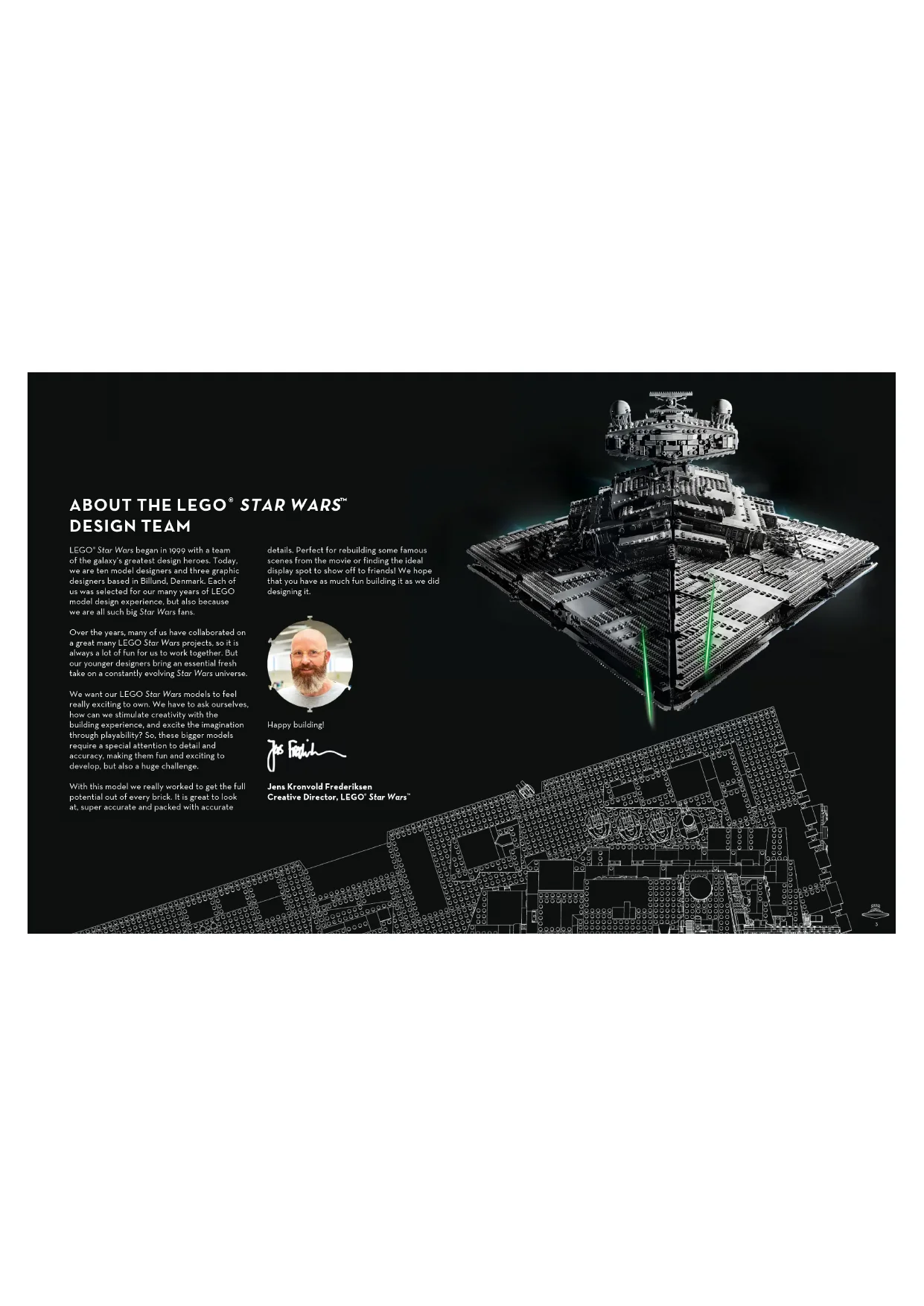 building set, so we focus our attention on detail and always aim to create an experience that hopefully not only meets, but also exceeds the fans’ expectations. Q: How many iterations of the Imperial Star Destroyer has the team worked on before? A: Oh, that’s a tough one. Many, many times in different formats, from sketches and 3D concept models to physical builds in different Jens Kronvold Frederiksen, Creative Director, LEGO
