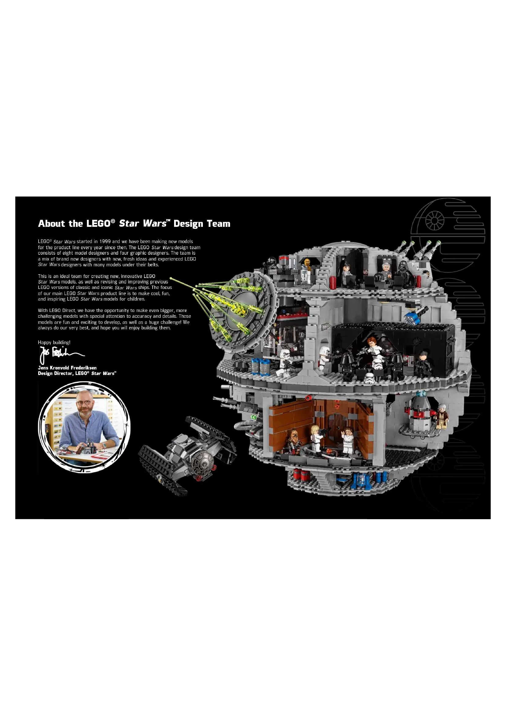 Star Wars : Return of the Jedi”), plus all the screenshots I could make or find to get an overview of the rooms and scenarios. Q: What kind of building techniques do you frequently use when designing a model of this scale? A: Stability is always an important feature for us when we design the models, but especially for models this size the emphasis is on stability, simply because of the weight and size of the model. In this set there’s a lot of stacking bricks, so it’s super important that both the walls and floors are stable. This ensures that the model is stable during the build phase and also afterwards when being played with. Q: One of the best features of the LEGO Star Wars Death Star are the rooms on the interior of the model. How did these factor into your design process when creating a model that needs to be functional while remaining stable? A: The rooms were very much given from the last incarnation of the model – however, I did work with optimizing the walls and floors for a better build flow. Securing stable walls and floors are key here, because once you start adding functions in or through walls or floors, you often remove stability. So ensuring that the model doesn’t get any weak spots (like exhaust ports) while adding lots of playable functions is really important and a big part of the challenge of designing a model like this. Niels Mølgård Frederiksen Niels Mølgård Frederiksen 8As I designed the new dianoga, I got the idea of adding playability to the trash compactor room. By making a hole in the floor, the dianoga could peek up through as if it was submerged in the muddy water. That task did present some challenges but I’m quite fond of the end result and hope it will add lots of fun to that scenario. Besides that, I’ve made changes in the building flow and improved the building experience. Q: Was there anything unique about designing the round surface of the Death Star while accommodating the planet killer laser? A: I managed to add more articulation to the planet killer laser in comparison to the previous incarnation. So yes, I of course had to be aware of the confinements, so the planet killer laser’s disc wouldn’t hit the walls and floors of the Death Star. Q: What did you find most challenging about the design for the Death Star? A: It was probably redesigning Vader’s TIE X-1 Advanced to accommodate the Darth Vader minifigure with the new two-piece helmet. The TIE vehicle went through numerous iterations before I had a model where I was satisfied with the design, stability, and building experience. Q: Was there anything in your original design that was not included in the final set? A: No, actually not. Well, minor changes from my original sketches and iterations, but nothing major was left out.10 Meet the Graphic Designer Q: What LEGO